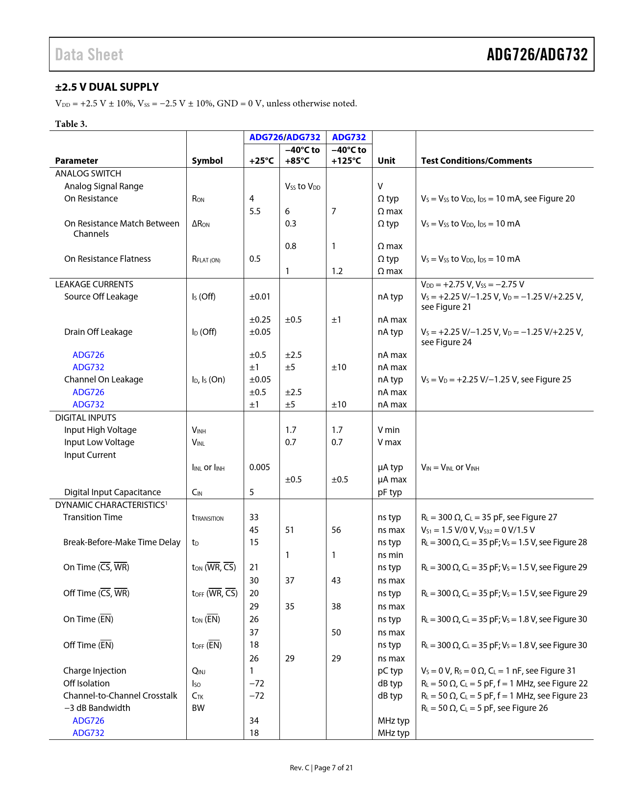 Data Sheet. ADG726/ADG732. ±2.5 V DUAL SUPPLY. Table 3. ADG726/. ADG732. −40°C to. Parameter Symbol. +25°C. +85°C. +125°C. Unit Test