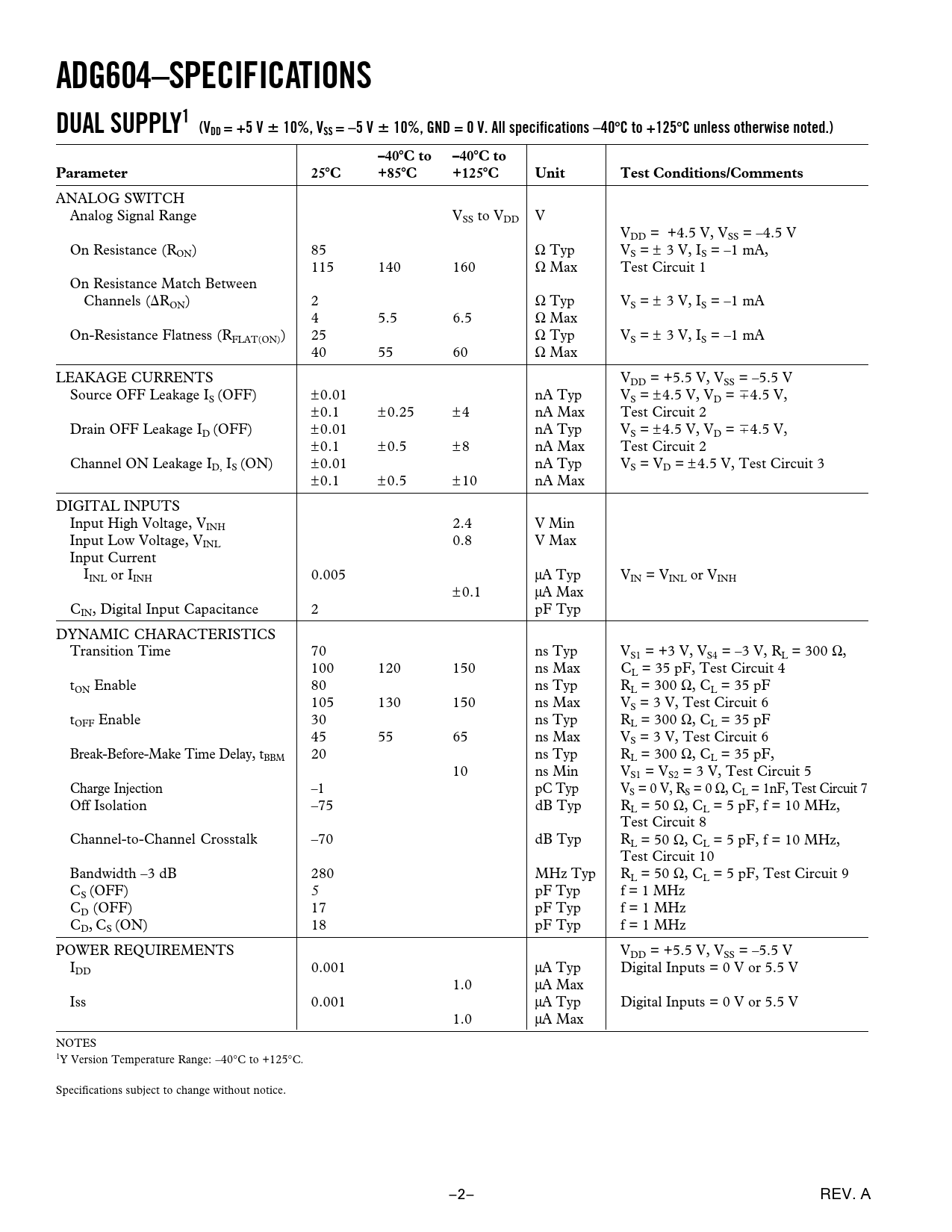 ADG604–SPECIFICATIONS DUAL SUPPLY1 (VDD = +5 V 10%, VSS = –5 V 10%, GND = 0 V. All specifications –40 C to +125 C unless otherwise noted.) –40 C to –40 C to Parameter 25 C +85 C +125 C Unit Test Conditions/Comments