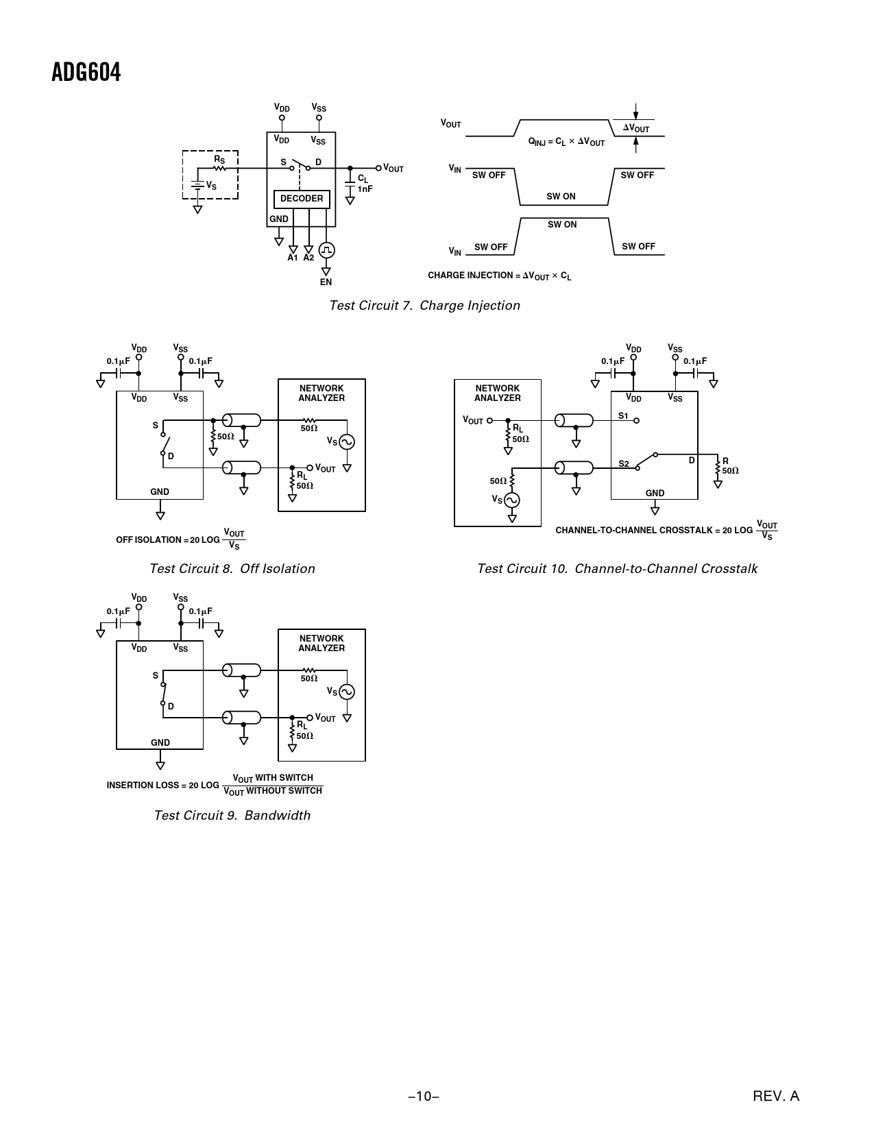 | Páginas / Página | 11 / 10 — ADG604. VDD. VSS. VOUT. QINJ = CL. VIN. SW OFF. 1nF. SW ON. DECODER. GND. … |
