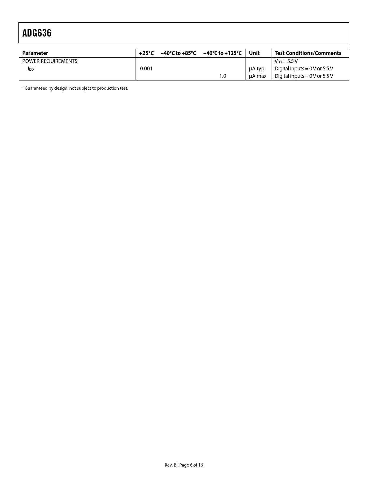 Páginas / Página16 / 6 — ADG636. Parameter. +25°C. −40°C to +85°C. −40°C to +125°C. Unit. Test …