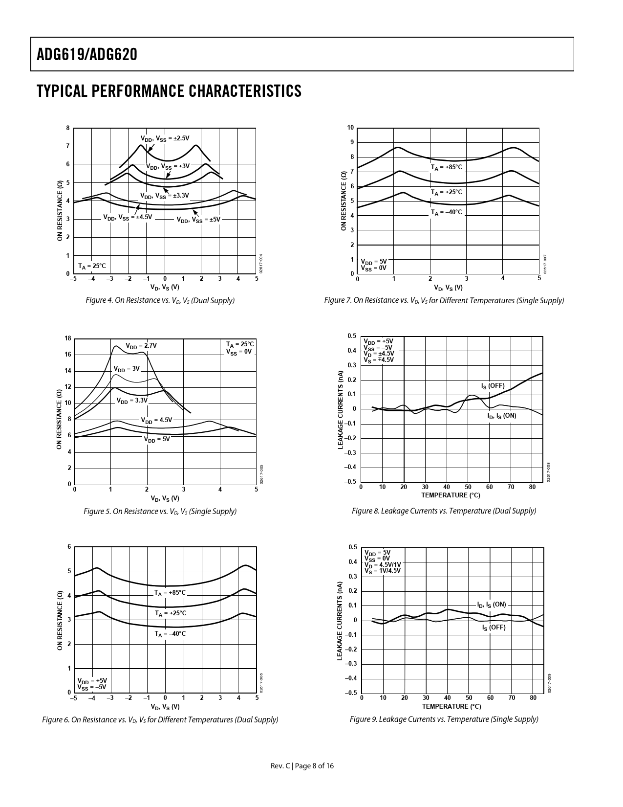 Figure 5. On Resistance vs. VD, VS (Single Supply) Figure 8. Leakage Currents vs. Temperature (Dual Supply)