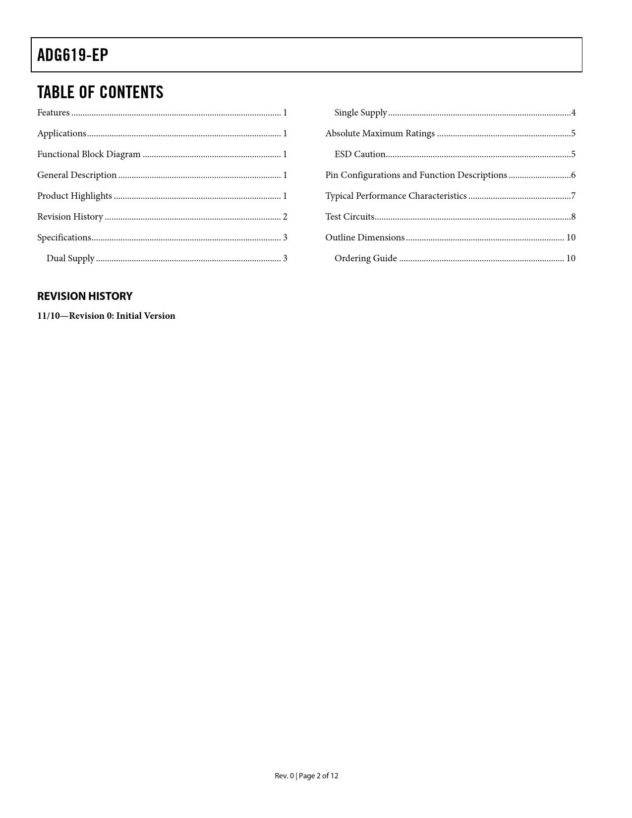 Páginas / Página12 / 2 — ADG619-EP. TABLE OF CONTENTS. REVISION HISTORY. 11/10—Revision 0: Initial …
