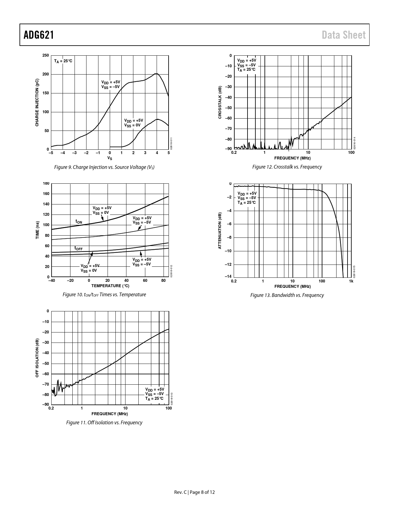 ADG621. Data Sheet. 250. A = 25°C. DD = +5V. –10. SS = –5V. TA = 25°C. 200. –20. –30. N (. B) d. 150. K (. –40. AL T. NJE. –50. 100. CRO. –60. VDD = +5V. CHARG