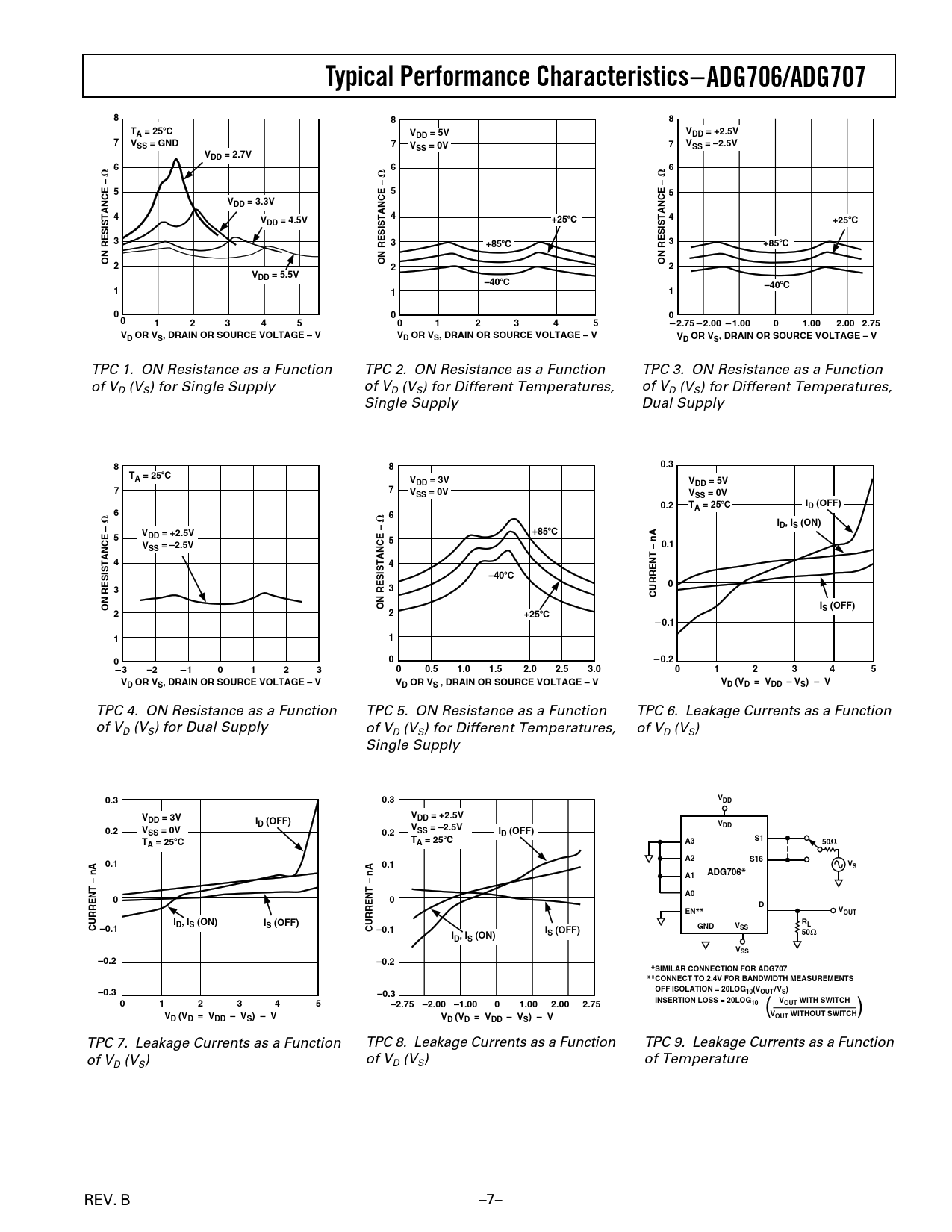 Typical Performance Characteristics–ADG706/ADG707888TA = 25 ⴗ CVVDD = 5VDD = +2.5V7VSS = GND7V7VSS = 0VSS = –2.5VVDD = 2.7V666 ⍀ ⍀ ⍀ 555VDD = 3.3V44V+25 ⴗ C4DD = 4.5V+25 ⴗ C33+85 ⴗ C3+85 ⴗ CON RESISTANCE –ON RESISTANCE –ON RESISTANCE –222VDD = 5.5V–40 ⴗ C–40 ⴗ C111000012345012345 ⴚ 2.75 ⴚ 2.00 ⴚ 1.0001.002.00 2.75VD OR VS, DRAIN OR SOURCE VOLTAGE – VVD OR VS, DRAIN OR SOURCE VOLTAGE – VVD OR VS, DRAIN OR SOURCE VOLTAGE – V TPC 1. ON Resistance as a Function TPC 2. ON Resistance as a Function TPC 3. ON Resistance as a Function of VD (VS) for Single Supply of VD (VS) for Different Temperatures, of VD (VS) for Different Temperatures, Single Supply Dual Supply 880.3TA = 25 ⴗ CVDD = 3VVDD = 5V77VSS = 0VVSS = 0V0.2TIA = 25 ⴗ CD (OFF)6 ⍀ 6 ⍀ ID, IS (ON)V+85 ⴗ CDD = +2.5V55V0.1SS = –2.5V44–40 ⴗ C033CURRENT – nAON RESISTANCE –ON RESISTANCE –IS (OFF)22+25 ⴗ C ⴚ 0.11100 ⴚ 0.2 ⴚ 3–2 ⴚ 1012300.51.01.52.02.53.0012345VD OR VS, DRAIN OR SOURCE VOLTAGE – VVD OR VS , DRAIN OR SOURCE VOLTAGE – VVD (VD = VDD – VS) – V TPC 4. ON Resistance as a Function TPC 5. ON Resistance as a Function TPC 6. Leakage Currents as a Function of VD (VS) for Dual Supply of VD (VS) for Different Temperatures, of VD (VS) Single Supply 0.30.3VDDVVDD = 3VIDD = +2.5VD (OFF)VDD0.2VVSS = 0VSS = –2.5V0.2ID (OFF)TTS1A3A = 25 ⴗ CA = 25 ⴗ C50 ⍀ A2S160.10.1VSA1ADG706*A000DEN**VOUTIRCURRENT – nA –0.1D, IS (ON)IS (OFF)CURRENT – nAVL–0.1IGNDSSIS (OFF)50 ⍀ D, IS (ON)VSS–0.2–0.2*SIMILAR CONNECTION FOR ADG707**CONNECT TO 2.4V FOR BANDWIDTH MEASUREMENTS–0.3OFF ISOLATION = 20LOG–0.310(VOUT /VS)012345–2.75 –2.00 –1.0001.002.002.75INSERTION LOSS = 20LOG10 VOUT WITH SWITCH ( ) VVD (VD = VDD – VS) – VVD (VD = VDD – VS) – VOUT WITHOUT SWITCH TPC 7. Leakage Currents as a Function TPC 8. Leakage Currents as a Function TPC 9. Leakage Currents as a Function of V of V of Temperature D (VS) D (VS) REV. B –7–
