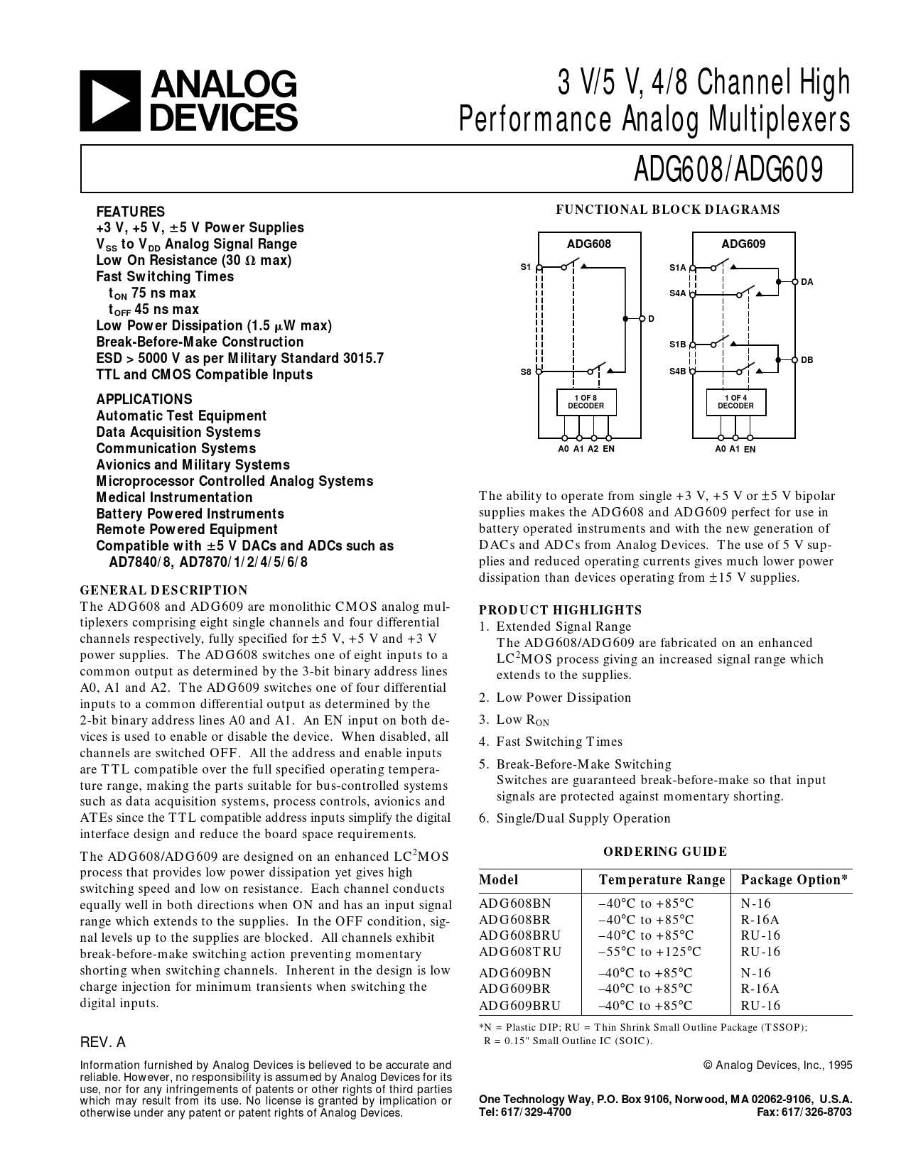 3 V/5 V, 4/8 Channel High Performance Analog Multiplexers ADG608/ADG609 FUNCTIONAL BLOCK DIAGRAMS FEATURES +3 V, +5 V,