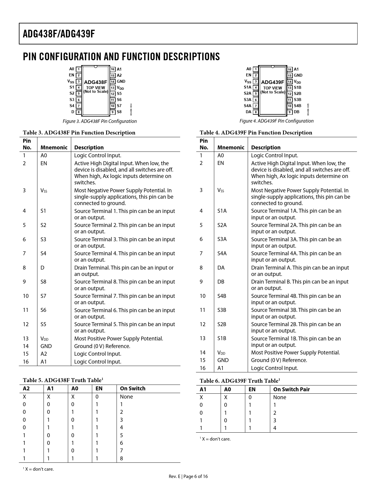 ADG438F/ADG439F. PIN CONFIGURATION AND FUNCTION DESCRIPTIONS. A0 1. 16 A1. EN 2. 15 A2. 15 GND. VSS 3. 14 GND. ADG438F. 14 V. ADG439F. S1 4