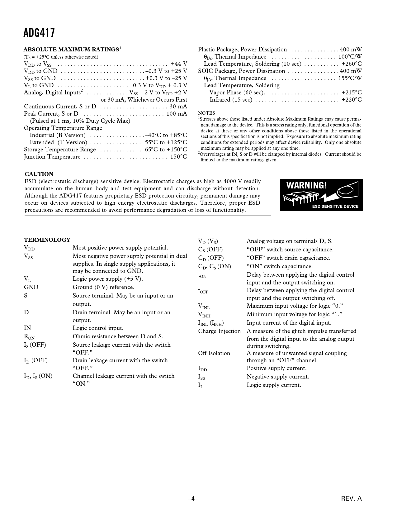 ADG417. ABSOLUTE MAXIMUM RATINGS1. CAUTION. WARNING!. ESD SENSITIVE DEVICE. TERMINOLOGY