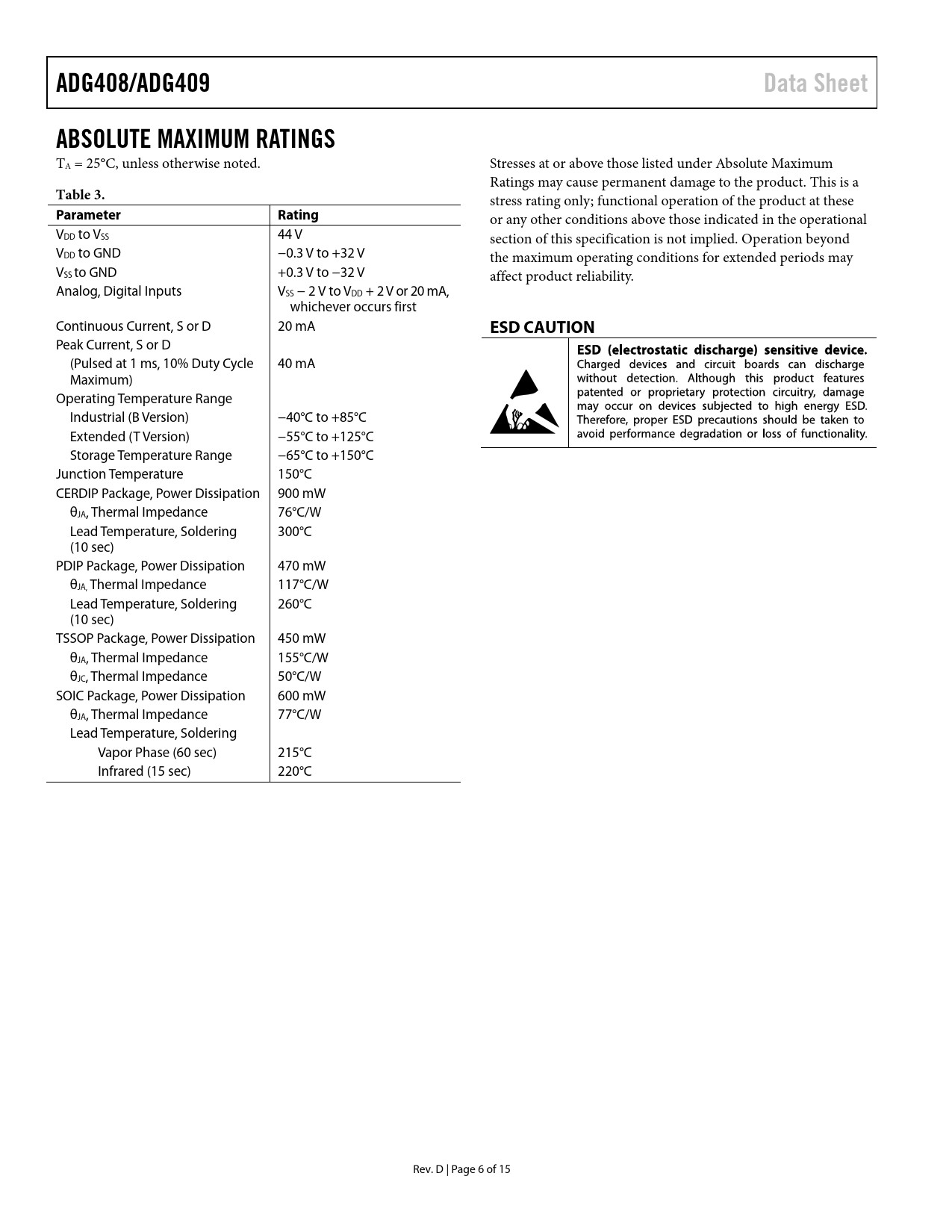 ADG408/ADG409. Data Sheet. ABSOLUTE MAXIMUM RATINGS. Table 3. Parameter Rating. ESD CAUTION