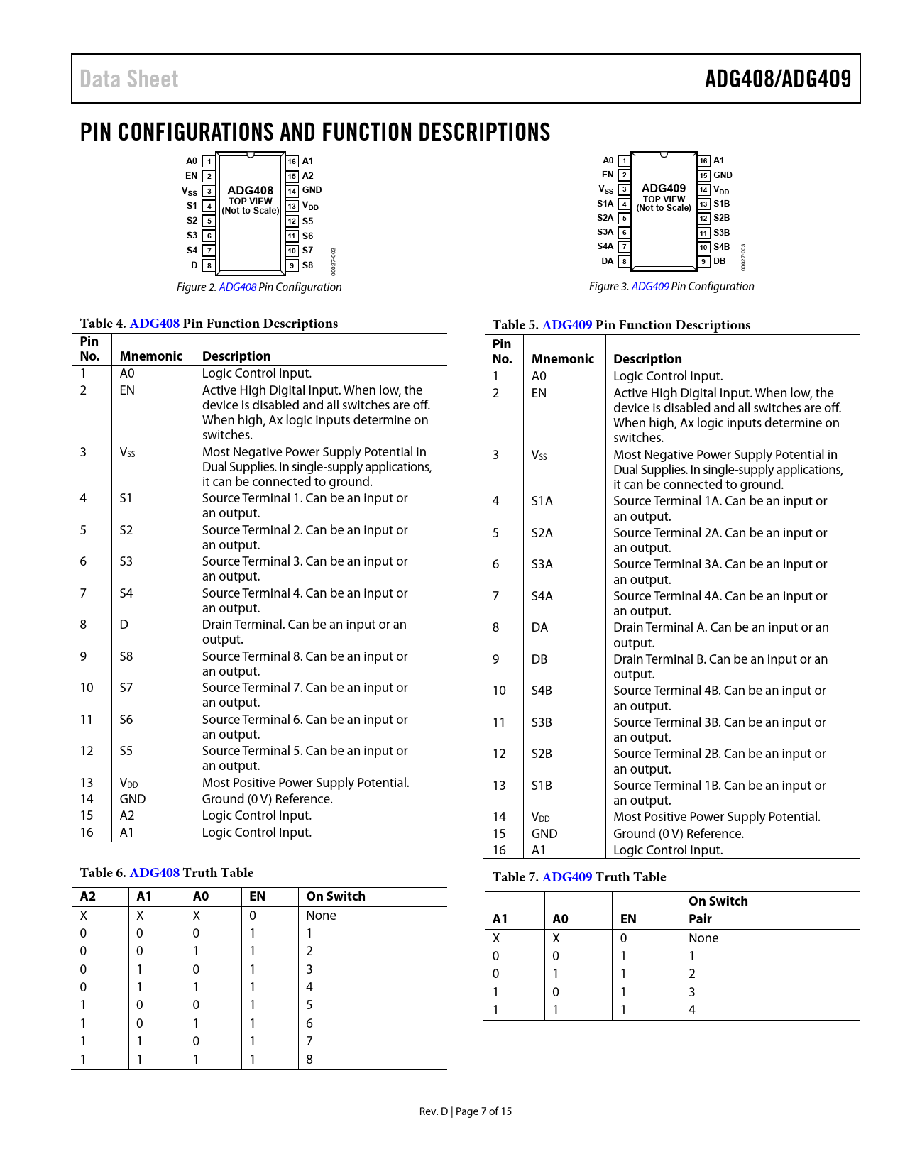 Páginas / Página15 / 7 — Data Sheet. ADG408/ADG409. PIN CONFIGURATIONS AND FUNCTION DESCRIPTIONS. …