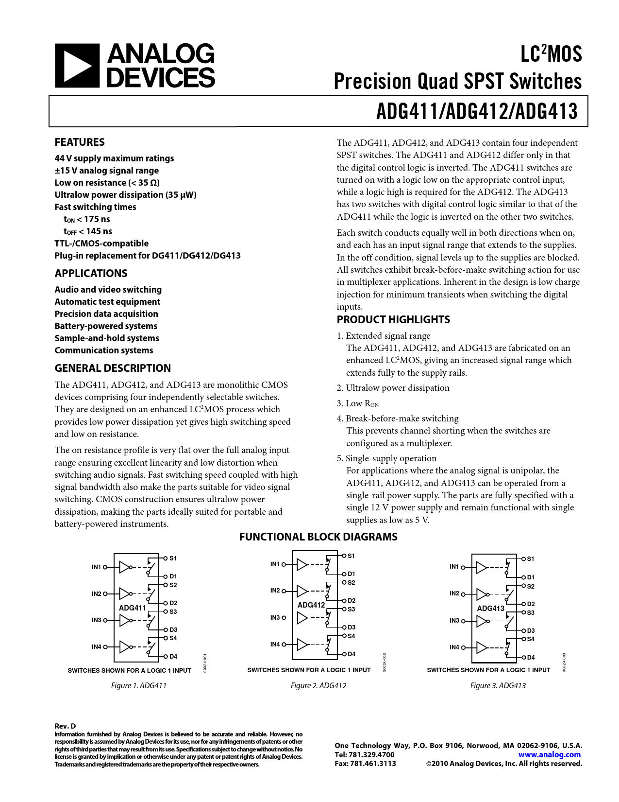 LC2MOS. Precision Quad SPST Switches. ADG411/ADG412/ADG413. FEATURES. 44 V supply maximum ratings. ±15 V analog signal range