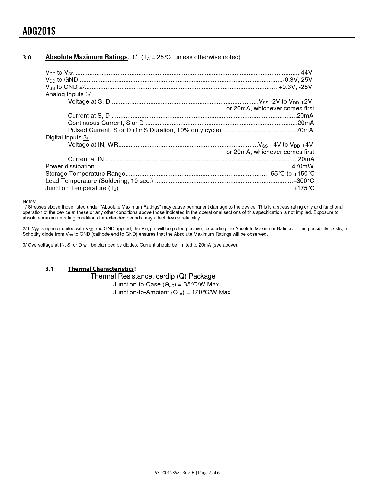. 1/ (TA = 25°C, unless otherwise noted) VDD to VSS ...44V VDD to GND...-0.3V, 25V VSS to GND 2/...+0.3V, -25V Analog Inputs 3/ Voltage at S, D ..VSS -2V to VDD +2V or 20mA, whichever comes first Current at S, D ..20mA Continuous Current, S or D ...20mA Pulsed Current, S or D (1mS Duration, 10% duty cycle) ..70mA Digital Inputs 3/ Voltage at IN, WR..VSS - 4V to VDD +4V or 20mA, whichever comes first Current at IN ..20mA Power dissipation...470mW Storage Temperature Range... -65°C to +150°C Lead Temperature (Soldering, 10 sec.) ...+300°C Junction Temperature (T )……………………………………………………….………………. +175°C J Notes: 1/ Stresses above those listed under "Absolute Maximum Ratings" may cause permanent damage to the device. This is a stress rating only and functional operation of the device at these or any other conditions above those indicated in the operational sections of this specification is not implied. Exposure to absolute maximum rating conditions for extended periods may affect device reliability. 2/ If VSS is open circuited with VDD and GND applied, the VSS pin will be pulled positive, exceeding the Absolute Maximum Ratings. If this possibility exists, a Schottky diode from VSS to GND (cathode end to GND) ensures that the Absolute Maximum Ratings will be observed. 3/ Overvoltage at IN, S, or D will be clamped by diodes. Current should be limited to 20mA (see above).