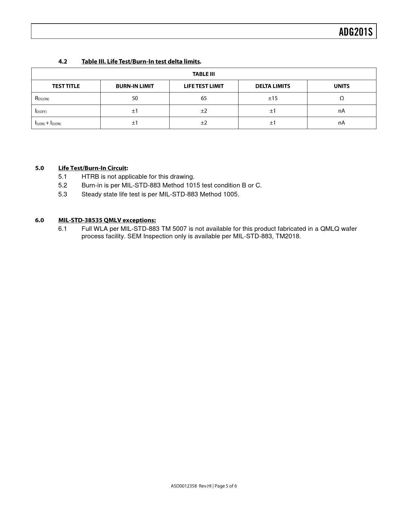 5.1 HTRB is not applicable for this drawing. 5.2 Burn-in is per MIL-STD-883 Method 1015 test condition B or C. 5.3 Steady state life test is per MIL-STD-883 Method 1005. 6.1 Full WLA per MIL-STD-883 TM 5007 is not available for this product fabricated in a QMLQ wafer process facility. SEM Inspection only is available per MIL-STD-883, TM2018.