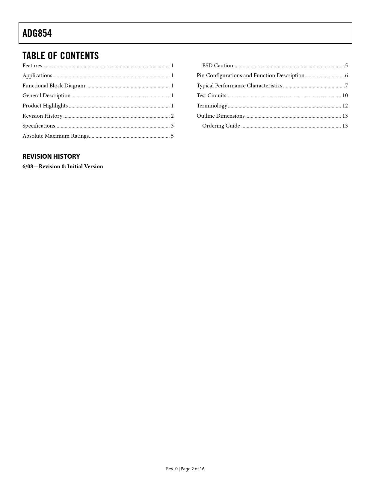 link to page 1 link to page 1 link to page 1 link to page 1 link to page 1 link to page 1 link to page 1 link to page 1 link to page 1 link to page 1 link to page 2 link to page 2 link to page 3 link to page 3 link to page 5 link to page 5 link to page 5 link to page 5 link to page 6 link to page 6 link to page 7 link to page 7 link to page 10 link to page 10 link to page 12 link to page 12 link to page 13 link to page 13 link to page 13 link to page 13 ADG854TABLE OF CONTENTS Features .. 1 ESD Caution...5 Applications ... 1 Pin Configurations and Function Description ..6 Functional Block Diagram .. 1 Typical Performance Characteristics ..7 General Description ... 1 Test Circuits ... 10 Product Highlights ... 1 Terminology .. 12 Revision History ... 2 Outline Dimensions ... 13 Specifications ... 3 Ordering Guide .. 13 Absolute Maximum Ratings .. 5 REVISION HISTORY6/08—Revision 0: Initial Version Rev. 0 | Page 2 of 16 Document Outline FEATURES APPLICATIONS FUNCTIONAL BLOCK DIAGRAM GENERAL DESCRIPTION PRODUCT HIGHLIGHTS TABLE OF CONTENTS REVISION HISTORY SPECIFICATIONS ABSOLUTE MAXIMUM RATINGS ESD CAUTION PIN CONFIGURATION AND FUNCTION DESCRIPTION TYPICAL PERFORMANCE CHARACTERISTICS TEST CIRCUITS TERMINOLOGY OUTLINE DIMENSIONS ORDERING GUIDE