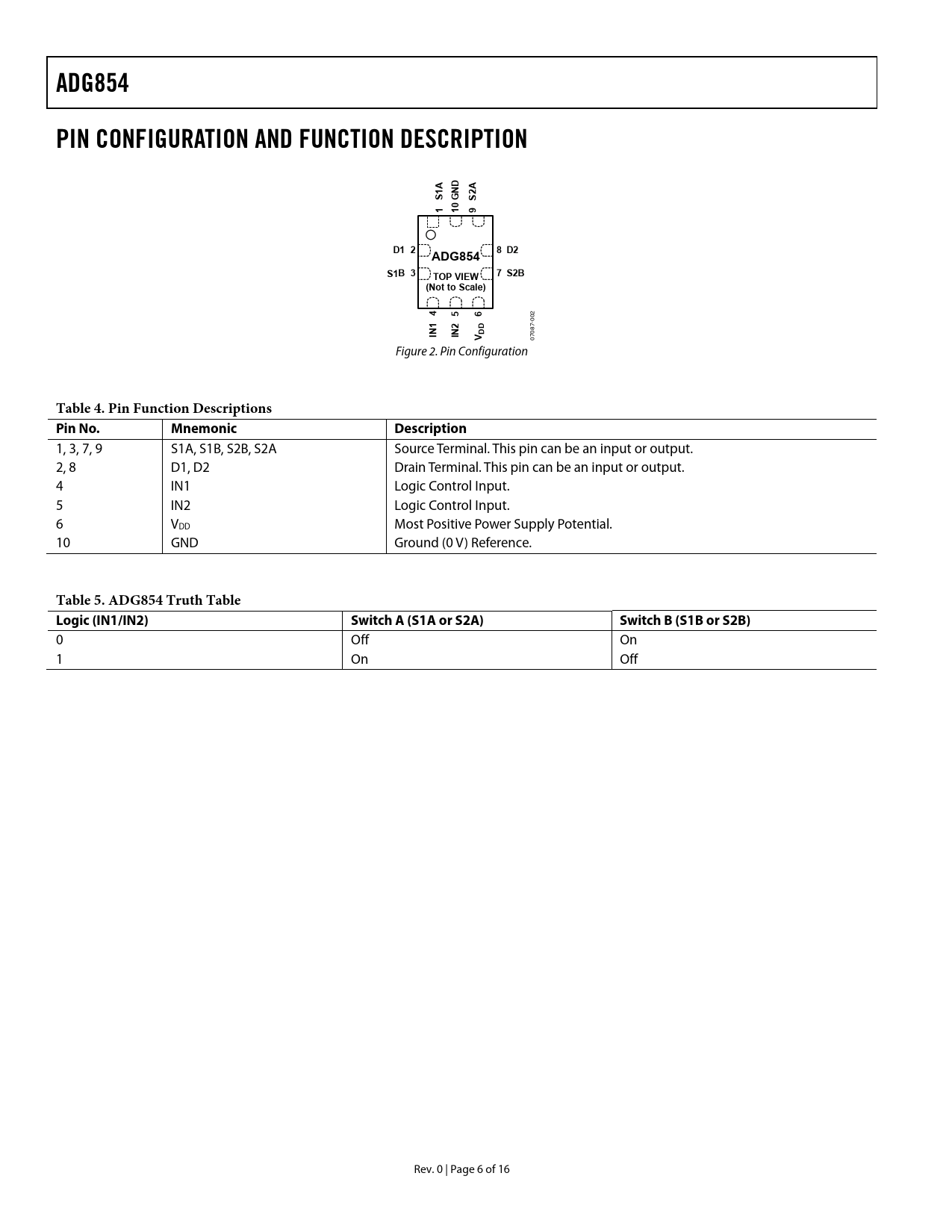 ADG854. PIN CONFIGURATION AND FUNCTION DESCRIPTION. D1 2. 8 D2. S1B 3. 7 S2B. TOP VIEW. (Not to Scale)