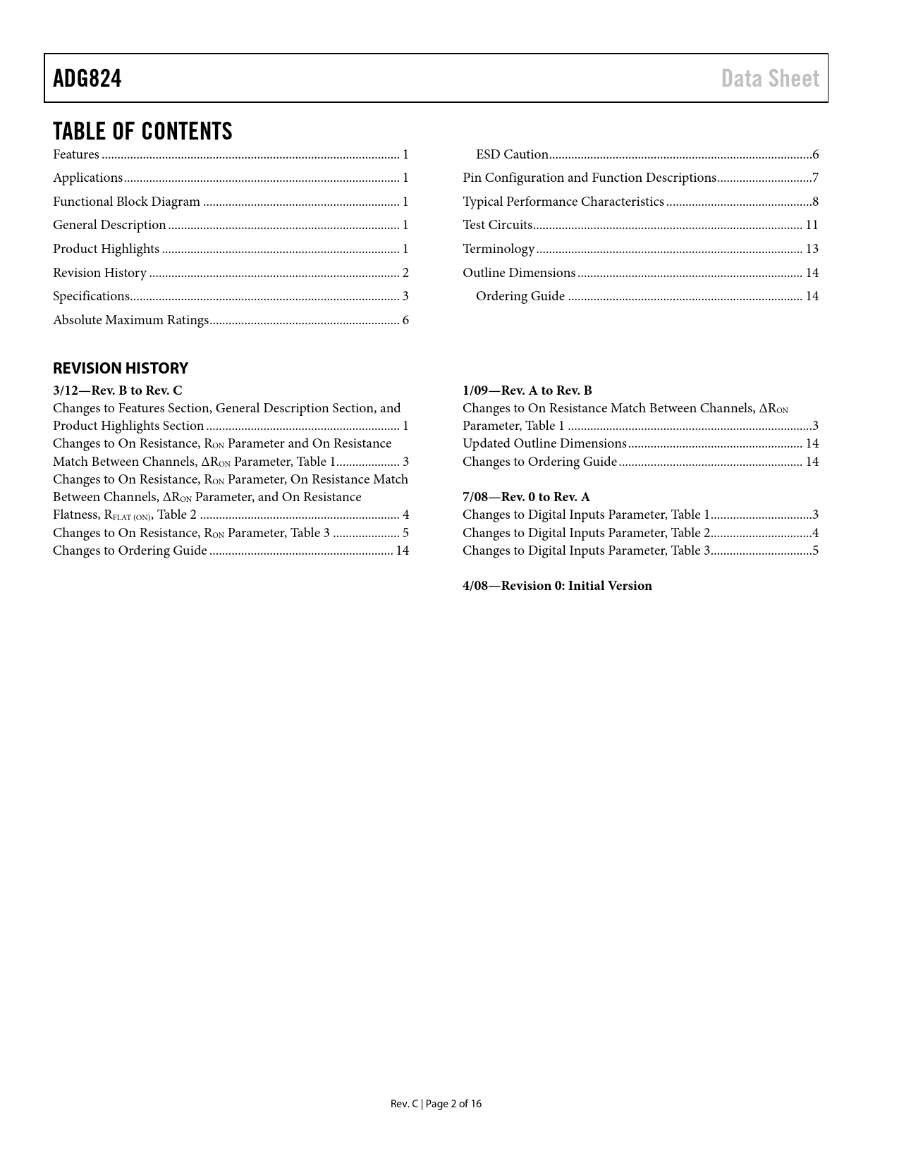 ADG824 Data Sheet TABLE OF CONTENTS REVISION HISTORY 3/12—Rev B to Rev C 1/09—Rev A to Rev B 7/08—Rev 0 to Rev A