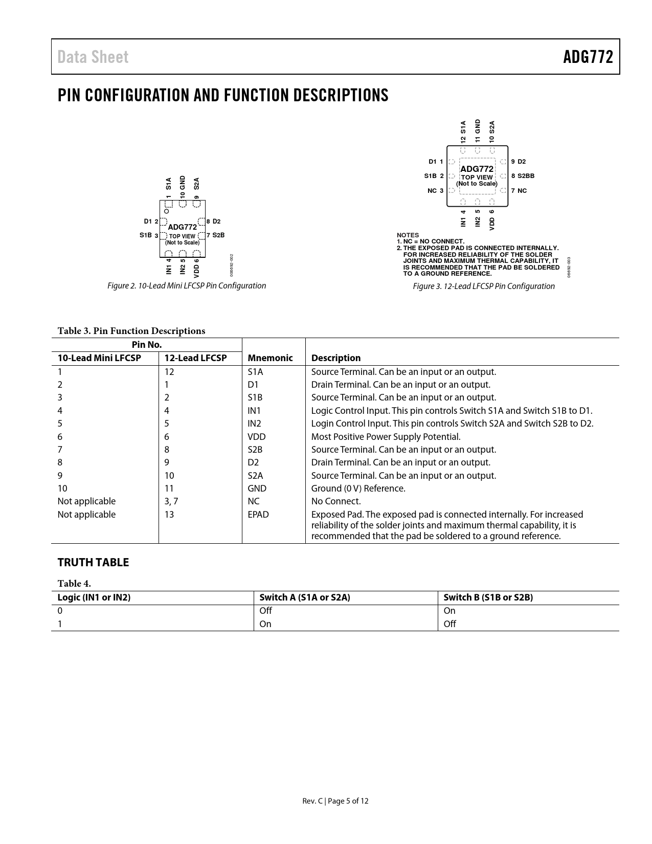 1 12 S1A Source Terminal. Can be an input or an output. 2 1 D1 Drain Terminal. Can be an input or an output. 3 2 S1B Source Terminal. Can be an input or an output. 4 4 IN1 Logic Control Input. This pin controls Switch S1A and Switch S1B to D1. 5 5 IN2 Login Control Input. This pin controls Switch S2A and Switch S2B to D2. 6 6 VDD Most Positive Power Supply Potential. 7 8 S2B Source Terminal. Can be an input or an output. 8 9 D2 Drain Terminal. Can be an input or an output. 9 10 S2A Source Terminal. Can be an input or an output. 10 11 GND Ground (0 V) Reference. Not applicable 3, 7 NC No Connect. Not applicable 13 EPAD Exposed Pad. The exposed pad is connected internally. For increased reliability of the solder joints and maximum thermal capability, it is recommended that the pad be soldered to a ground reference.