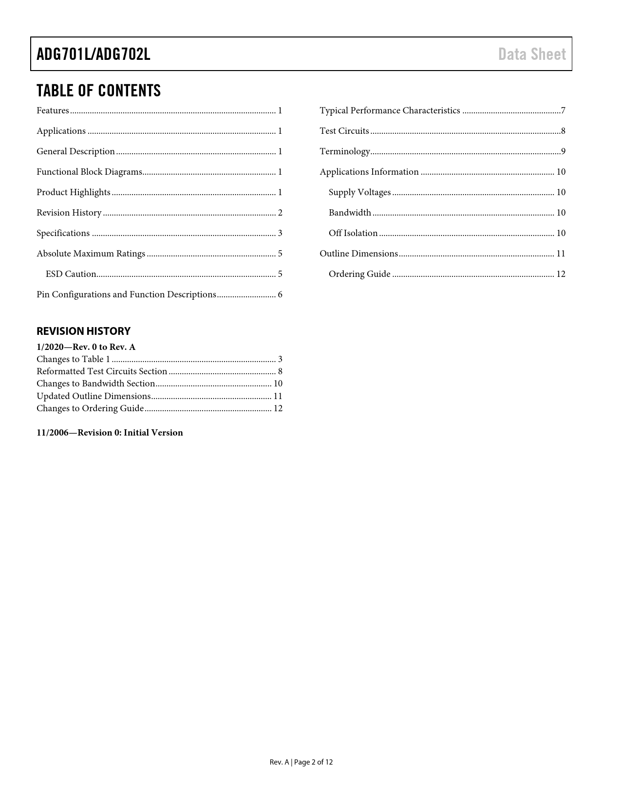 Páginas / Página12 / 2 — ADG701L/ADG702L. Data Sheet. TABLE OF CONTENTS. REVISION HISTORY. …