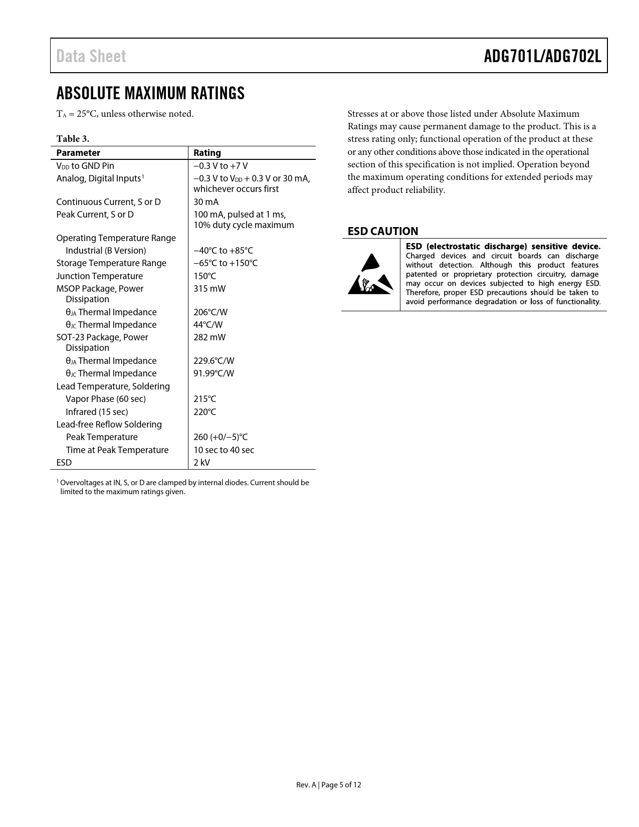 Data Sheet. ADG701L/ADG702L. ABSOLUTE MAXIMUM RATINGS. Table 3. Parameter. Rating. ESD CAUTION