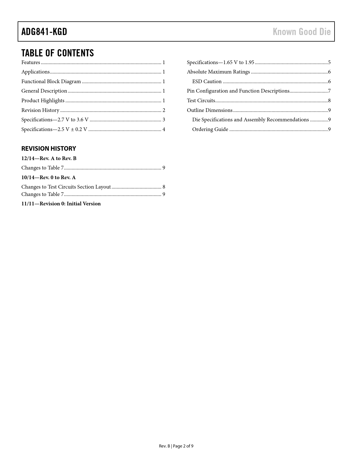 Páginas / Página9 / 2 — ADG841-KGD. Known Good Die. TABLE OF CONTENTS. REVISION HISTORY. …