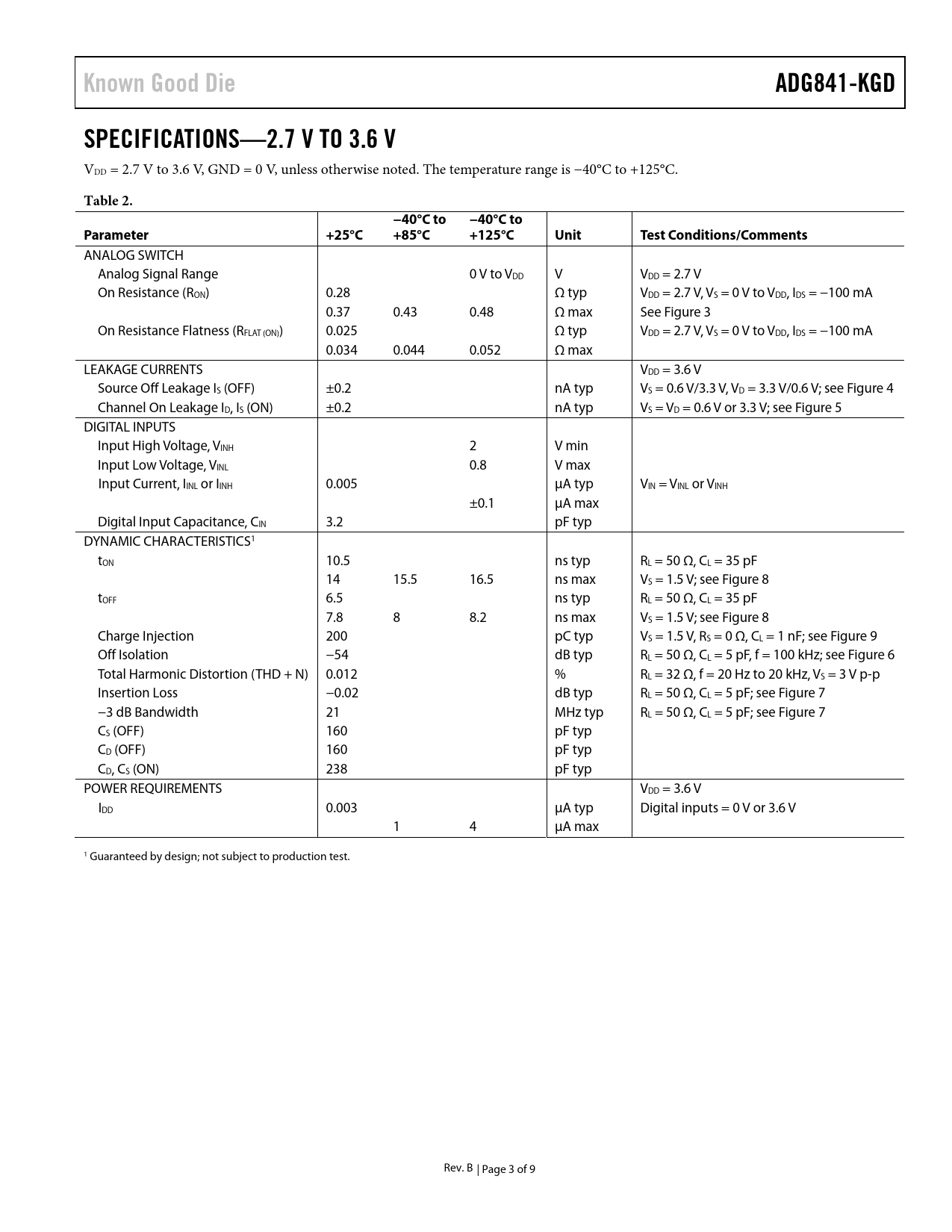 Known Good Die. ADG841-KGD. SPECIFICATIONS—2.7 V TO 3.6 V. Table 2. −40°C to. Parameter. +25°C. +85°C. +125°C. Unit