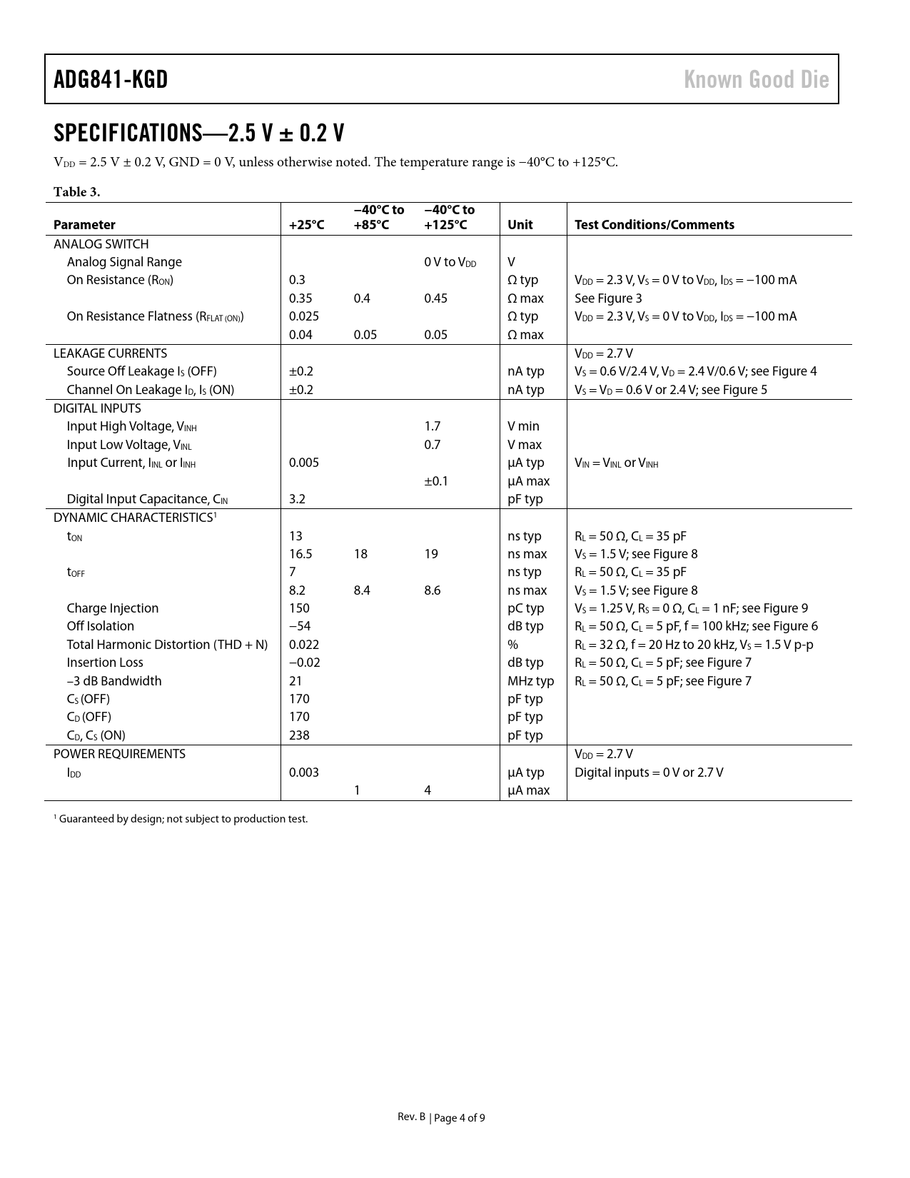 ADG841-KGD. Known Good Die. SPECIFICATIONS—2.5 V ± 0.2 V. Table 3. −40°C to. Parameter. +25°C. +85°C. +125°C. Unit
