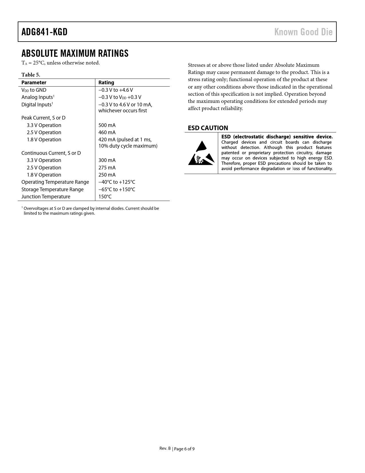 ADG841-KGD Known Good Die ABSOLUTE MAXIMUM RATINGS Table 5 Parameter Rating ESD CAUTION