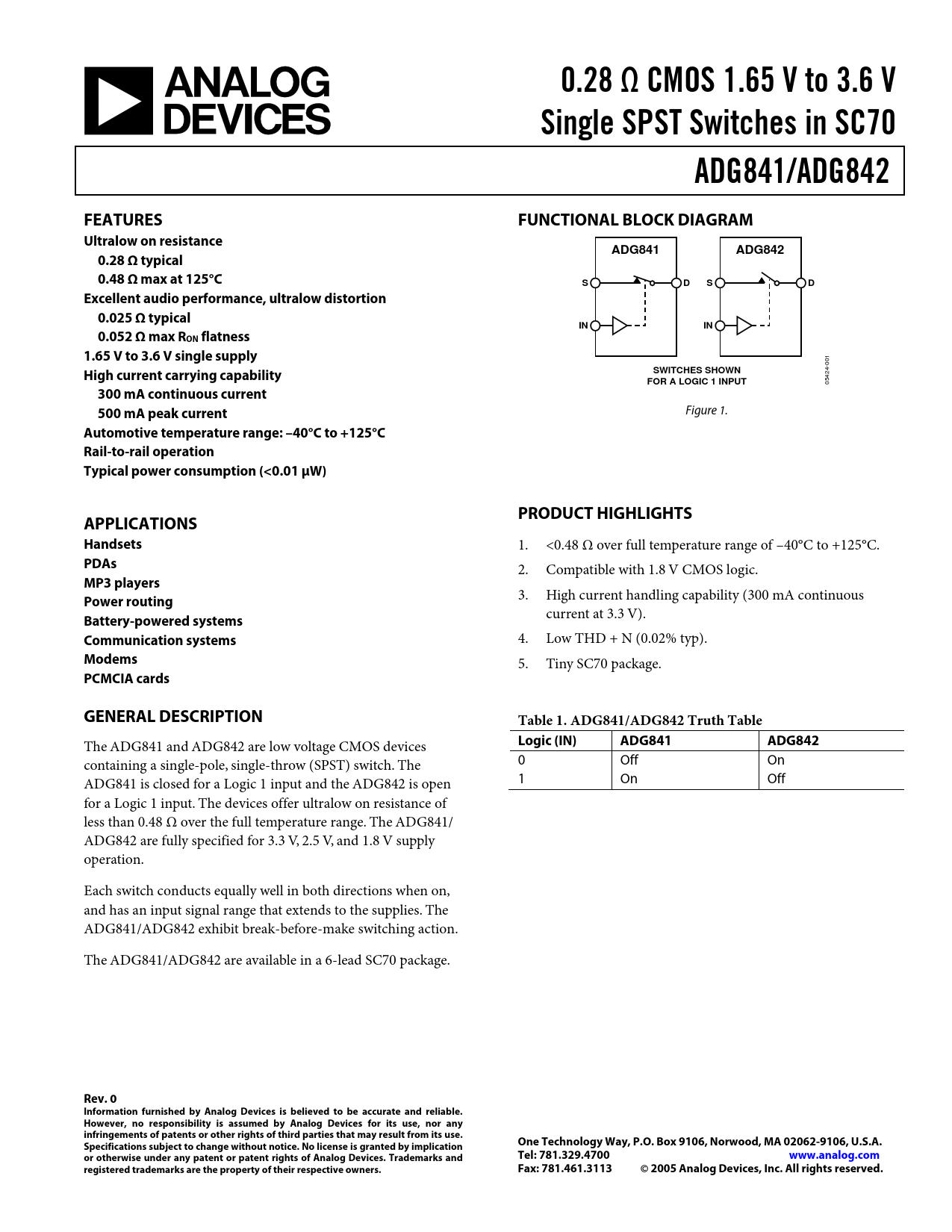 containing a single-pole, single-throw (SPST) switch. The 0 Off On ADG841 is closed for a Logic 1 input and the ADG842 is open 1 On Off for a Logic 1 input. The devices offer ultralow on resistance of less than 0.48 Ω over the full temperature range. The ADG841/ ADG842 are fully specified for 3.3 V, 2.5 V, and 1.8 V supply operation. Each switch conducts equally well in both directions when on, and has an input signal range that extends to the supplies. The ADG841/ADG842 exhibit break-before-make switching action. The ADG841/ADG842 are available in a 6-lead SC70 package.