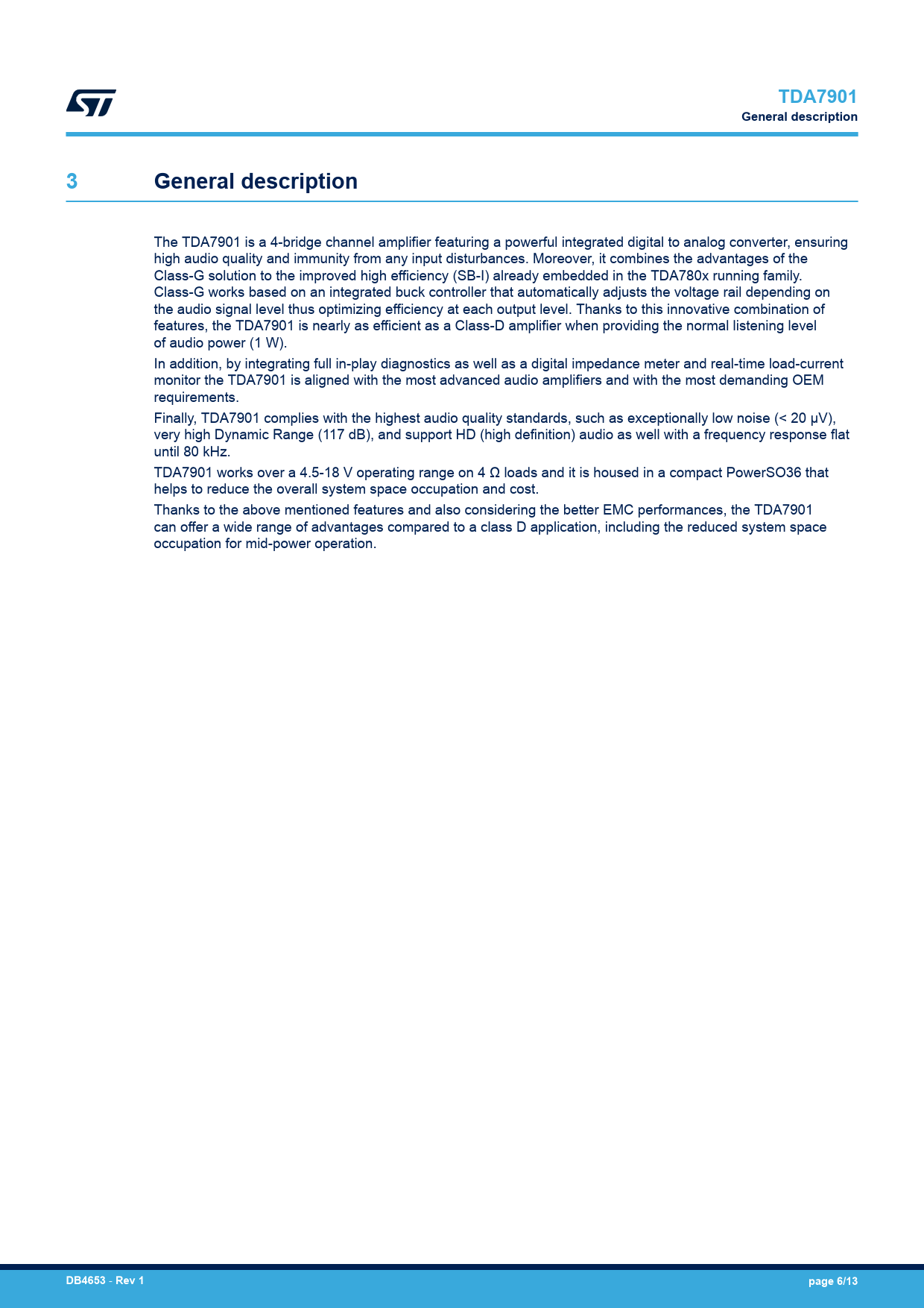 TDA7901General description3General description The TDA7901 is a 4-bridge channel amplifier featuring a powerful integrated digital to analog converter, ensuring high audio quality and immunity from any input disturbances. Moreover, it combines the advantages of the Class-G solution to the improved high efficiency (SB-I) already embedded in the TDA780x running family. Class-G works based on an integrated buck controller that automatically adjusts the voltage rail depending on the audio signal level thus optimizing efficiency at each output level. Thanks to this innovative combination of features, the TDA7901 is nearly as efficient as a Class-D amplifier when providing the normal listening level of audio power (1 W). In addition, by integrating full in-play diagnostics as well as a digital impedance meter and real-time load-current monitor the TDA7901 is aligned with the most advanced audio amplifiers and with the most demanding OEM requirements. Finally, TDA7901 complies with the highest audio quality standards, such as exceptionally low noise (< 20 μV), very high Dynamic Range (117 dB), and support HD (high definition) audio as well with a frequency response flat until 80 kHz. TDA7901 works over a 4.5-18 V operating range on 4 Ω loads and it is housed in a compact PowerSO36 that helps to reduce the overall system space occupation and cost. Thanks to the above mentioned features and also considering the better EMC performances, the TDA7901 can offer a wide range of advantages compared to a class D application, including the reduced system space occupation for mid-power operation. DB4653 - Rev 1page 6/13 Document Outline 1 Block diagram and pins description 1.1 Block diagram 1.2 Pin description 2 Electrical specifications 2.1 Thermal data 3 General description 4 Package information 4.1 PowerSO-36 (slug up) package information Revision history