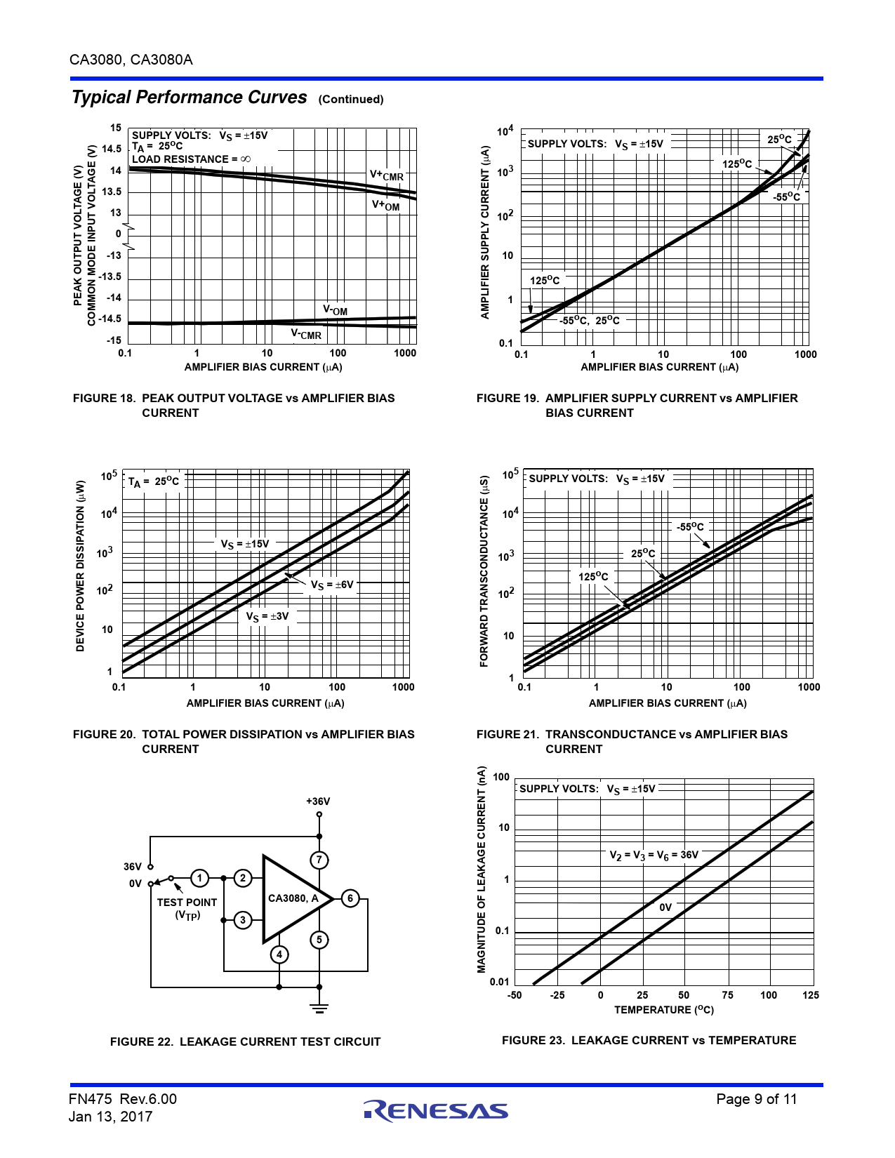 15V +36V 10 7 V2 = V3 = V6 = 36V 36V 1 2 0V 1 CA3080, A 6 TEST POINT 0V (VTP) 3 0.1 5 4 MAGNITUDE OF LEAKAGE CURRENT (nA) 0.01 -50 -25 0 25 50 75 100 125 TEMPERATURE (oC) FIGURE 22. LEAKAGE CURRENT TEST CIRCUIT FIGURE 23. LEAKAGE CURRENT vs TEMPERATURE