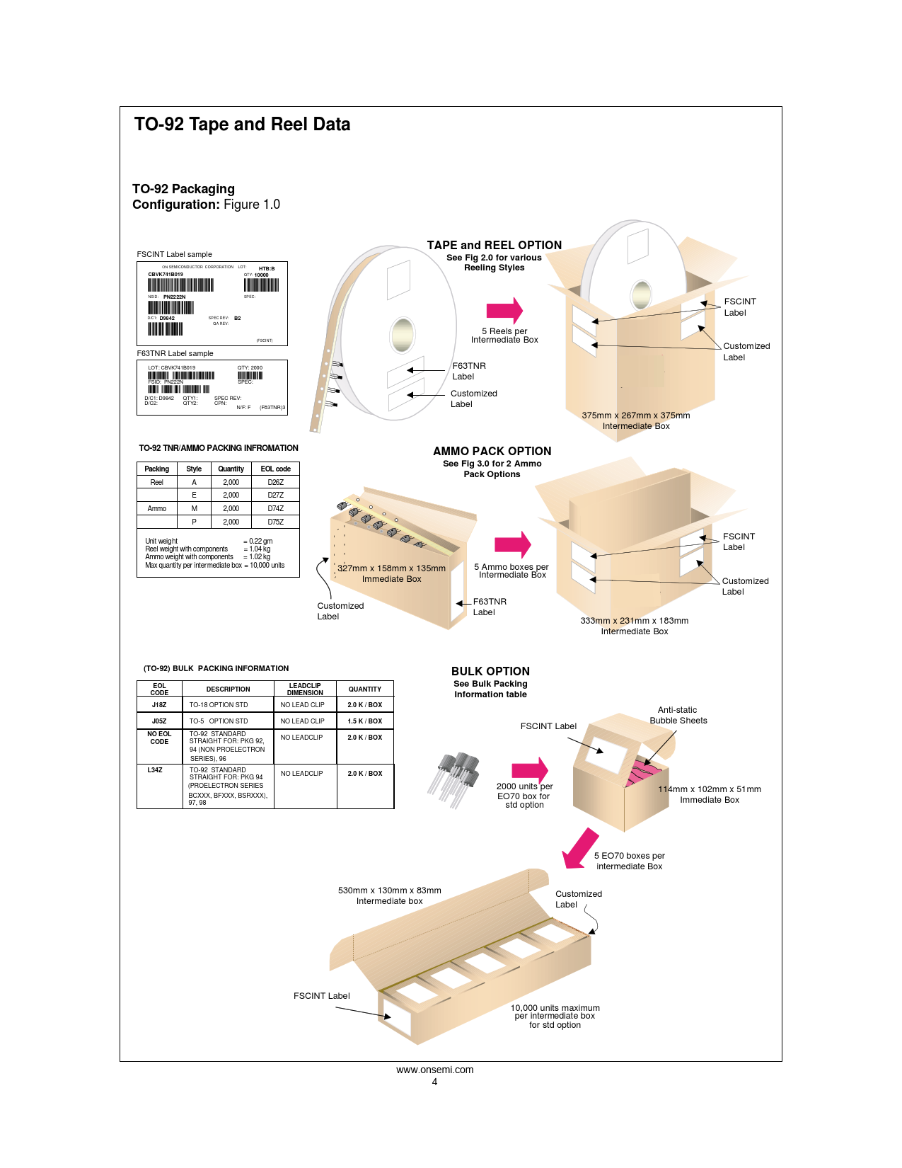 STRAIGHT FOR: PKG 94 (PROELECTRON SERIES 2000 units per 114mm x 102mm x 51mm BCXXX, BFXXX, BSRXXX), EO70 box for Immediate Box 97, 98 std option 5 EO70 boxes per intermediate Box 530mm x 130mm x 83mm Customized Intermediate box Label FSCINT Label 10,000 units maximum per intermediate box for std option www.onsemi.com 4