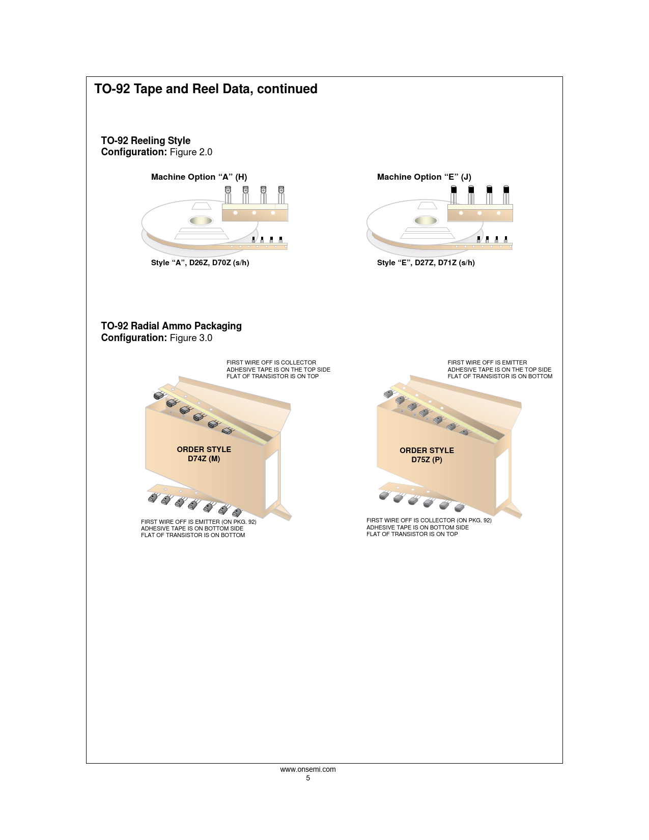 TO-92 Tape and Reel Data, continuedTO-92 Reeling Style Configuration: Figure 2.0 Machine Option “A” (H)Machine Option “E” (J)Style “A”, D26Z, D70Z (s/h)Style “E”, D27Z, D71Z (s/h)TO-92 Radial Ammo Packaging Configuration: Figure 3.0 FIRST WIRE OFF IS COLLECTOR FIRST WIRE OFF IS EMITTER ADHESIVE TAPE IS ON THE TOP SIDE ADHESIVE TAPE IS ON THE TOP SIDE FLAT OF TRANSISTOR IS ON TOP FLAT OF TRANSISTOR IS ON BOTTOM ORDER STYLEORDER STYLED74Z (M)D75Z (P) FIRST WIRE OFF IS EMITTER (ON PKG. 92) FIRST WIRE OFF IS COLLECTOR (ON PKG. 92) ADHESIVE TAPE IS ON BOTTOM SIDE ADHESIVE TAPE IS ON BOTTOM SIDE FLAT OF TRANSISTOR IS ON BOTTOM FLAT OF TRANSISTOR IS ON TOP www.onsemi.com 5