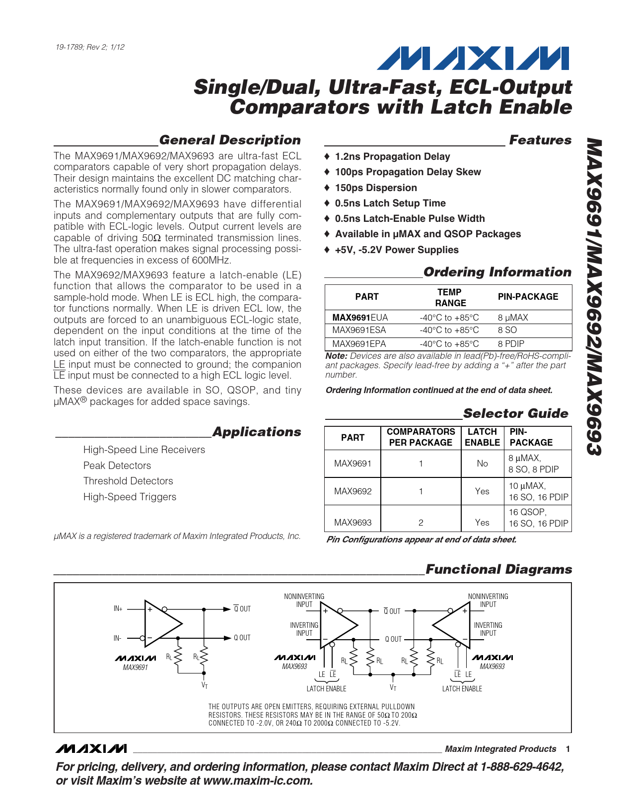 High-Speed Line Receivers 8 µMAX, Peak Detectors MAX9691 1 No 8 SO, 8 PDIP Threshold Detectors 10 µMAX, MAX9692 1 Yes High-Speed Triggers 16 SO, 16 PDIP 16 QSOP, MAX9693 2 Yes 16 SO, 16 PDIP µMAX is a registered trademark of Maxim Integrated Products, Inc.