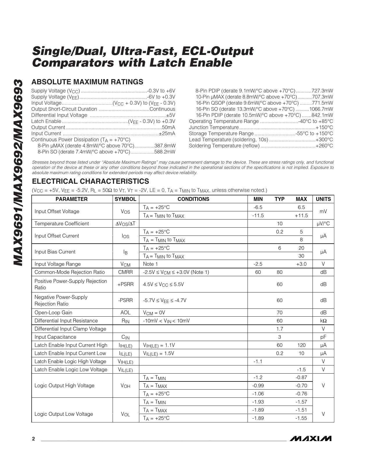 Single/Dual, Ultra-Fast, ECL-Output Comparators with Latch EnableABSOLUTE MAXIMUM RATINGS Supply Voltage (VCC) ...-0.3V to +6V 8-Pin PDIP (derate 9.1mW/°C above +70°C) ...727.3mW Supply Voltage (VEE)..-6V to +0.3V 10-Pin µMAX (derate 8.8mW/°C above +70°C) ...707.3mW Input Voltage..(VCC + 0.3V) to (VEE - 0.3V) 16-Pin QSOP (derate 9.6mW/°C above +70°C) ...771.5mW Output Short-Circuit Duration ..Continuous 16-Pin SO (derate 13.3mW/°C above +70°C) ..1066.7mW Differential Input Voltage ..±5V 16-Pin PDIP (derate 10.5mW/°C above +70°C) ...842.1mW Latch Enable ...(VEE - 0.3V) to +0.3V Operating Temperature Range ...-40°C to +85°C Output Current ..50mA Junction Temperature ..+150°C Input Current ..±25mA Storage Temperature Range ...-55°C to +150°C Continuous Power Dissipation (TA = +70°C) Lead Temperature (soldering, 10s) ...+300°C 8-Pin µMAX (derate 4.8mW/°C above 70°C)...387.8mW Soldering Temperature (reflow) ...+260°C 8-Pin SO (derate 7.4mW/°C above +70°C)..588.2mW Stresses beyond those listed under “Absolute Maximum Ratings” may cause permanent damage to the device. These are stress ratings only, and functional operation of the device at these or any other conditions beyond those indicated in the operational sections of the specifications is not implied. Exposure to absolute maximum rating conditions for extended periods may affect device reliability. ELECTRICAL CHARACTERISTICS (VCC = +5V, VEE = -5.2V, RL = 50Ω to VT, VT = -2V, LE = 0, TA = TMIN to TMAX, unless otherwise noted.) PARAMETERSYMBOLCONDITIONSMINTYPMAXUNITS TA = +25°C -6.5 6.5 Input Offset Voltage VOS mV TA = T MIN to TMAX -11.5 +11.5 Temperature Coefficient ∆VOS/∆T 10 µV/°C TA = +25°C 0.2 5 Input Offset Current IOS µA TA = T MIN to TMAX 8 TA = +25°C 6 20 Input Bias Current IB µA TA = T MIN to TMAX 30 MAX9691/MAX9692/MAX9693 Input Voltage Range VCM Note 1 -2.5 +3.0 V Common-Mode Rejection Ratio CMRR -2.5V ≤ VCM ≤ +3.0V (Note 1) 60 80 dB Positive Power-Supply Rejection +PSRR 4.5V ≤ VCC ≤ 5.5V 60 dB Ratio Negative Power-Supply -PSRR -5.7V ≤ VEE ≤ -4.7V 60 dB Rejection Ratio Open-Loop Gain AOL VCM = 0V 70 dB Differential Input Resistance RIN -10mV < VIN < 10mV 60 kΩ Differential Input Clamp Voltage 1.7 V Input Capacitance CIN 3 pF Latch Enable Input Current High IIH(LE) VIH(LE) = 1.1V 60 120 µA Latch Enable Input Current Low IIL(LE) VIL(LE) = 1.5V 0.2 10 µA Latch E nab l e Log i c H i g h V ol tag e VIH(LE) -1.1 V Latch Enable Logic Low Voltage VIL(LE) -1.5 V TA = TMIN -1.2 -0.87 Logic Output High Voltage VOH TA = TMAX -0.99 -0.70 V TA = +25°C -1.06 -0.76 TA = TMIN -1.93 -1.57 TA = TMAX -1.89 -1.51 Logic Output Low Voltage VOL V TA = +25°C -1.89 -1.55 2_______________________________________________________________________________________
