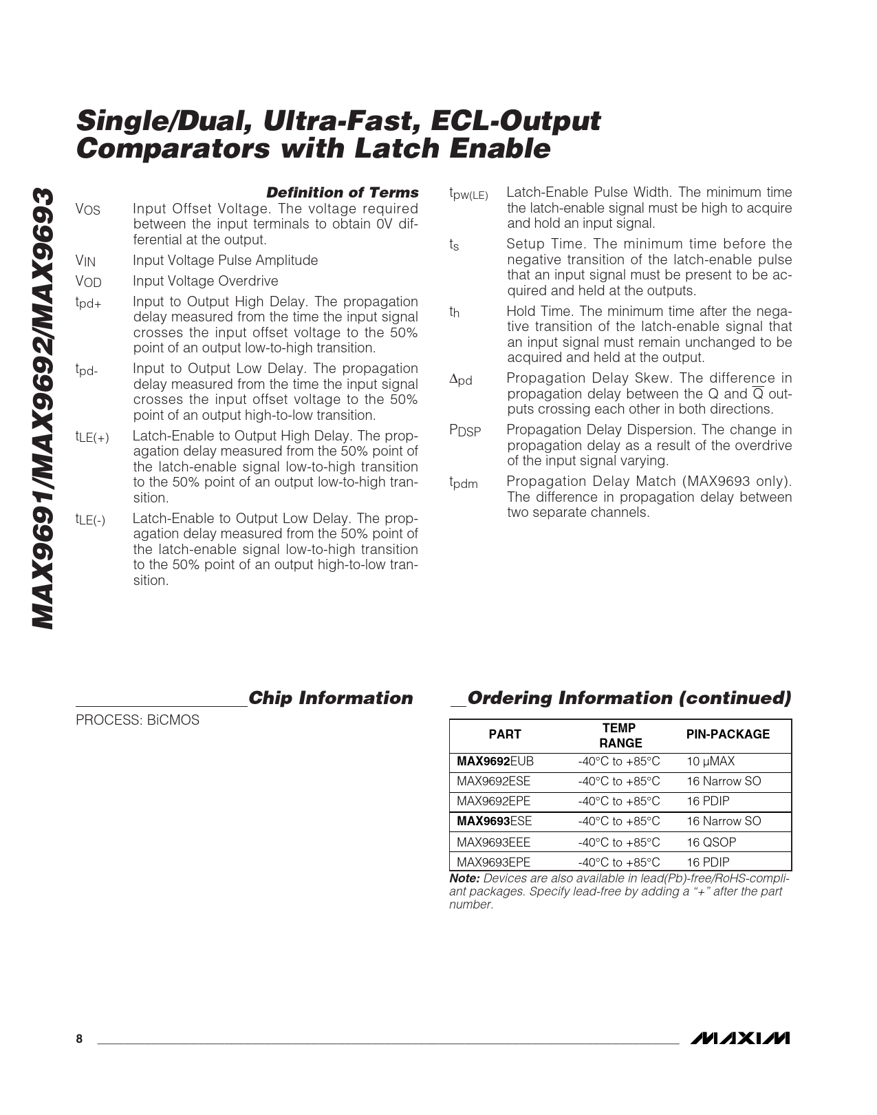Single/Dual, Ultra-Fast, ECL-Output Comparators with Latch EnableDefinition of Terms tpw(LE) Latch-Enable Pulse Width. The minimum time VOS Input Offset Voltage. The voltage required the latch-enable signal must be high to acquire between the input terminals to obtain 0V dif- and hold an input signal. ferential at the output. ts Setup Time. The minimum time before the VIN Input Voltage Pulse Amplitude negative transition of the latch-enable pulse V that an input signal must be present to be ac- OD Input Voltage Overdrive quired and held at the outputs. tpd+ Input to Output High Delay. The propagation delay measured from the time the input signal th Hold Time. The minimum time after the nega- crosses the input offset voltage to the 50% tive transition of the latch-enable signal that point of an output low-to-high transition. an input signal must remain unchanged to be acquired and held at the output. tpd- Input to Output Low Delay. The propagation delay measured from the time the input signal ∆pd Propagation Delay Skew. The difference in crosses the input offset voltage to the 50% propagation delay between the Q and Q out- point of an output high-to-low transition. puts crossing each other in both directions. t PDSP Propagation Delay Dispersion. The change in LE(+) Latch-Enable to Output High Delay. The prop- agation delay measured from the 50% point of propagation delay as a result of the overdrive the latch-enable signal low-to-high transition of the input signal varying. to the 50% point of an output low-to-high tran- tpdm Propagation Delay Match (MAX9693 only). sition. The difference in propagation delay between t two separate channels. LE(-) Latch-Enable to Output Low Delay. The prop- agation delay measured from the 50% point of the latch-enable signal low-to-high transition to the 50% point of an output high-to-low tran- sition. MAX9691/MAX9692/MAX9693Chip InformationOrdering Information (continued) PROCESS: BiCMOS TEMPPARTPIN-PACKAGERANGEMAX9692 EUB -40°C to +85°C 10 µMAX MAX9692ESE -40°C to +85°C 16 Narrow SO MAX9692EPE -40°C to +85°C 16 PDIP MAX9693 ESE -40°C to +85°C 16 Narrow SO MAX9693EEE -40°C to +85°C 16 QSOP MAX9693EPE -40°C to +85°C 16 PDIP Note: Devices are also available in lead(Pb)-free/RoHS-compli- ant packages. Specify lead-free by adding a “+” after the part number. 8_______________________________________________________________________________________