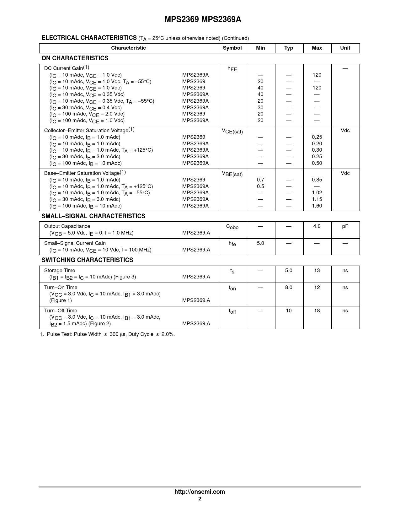 MPS2369 MPS2369A. ELECTRICAL CHARACTERISTICS. Characteristic. Symbol. Min. Typ. Max. Unit. ON CHARACTERISTICS