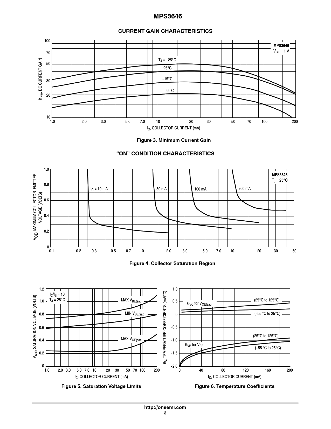 MPS3646. CURRENT GAIN CHARACTERISTICS. Figure 3. Minimum Current Gain. “ON” CONDITION CHARACTERISTICS