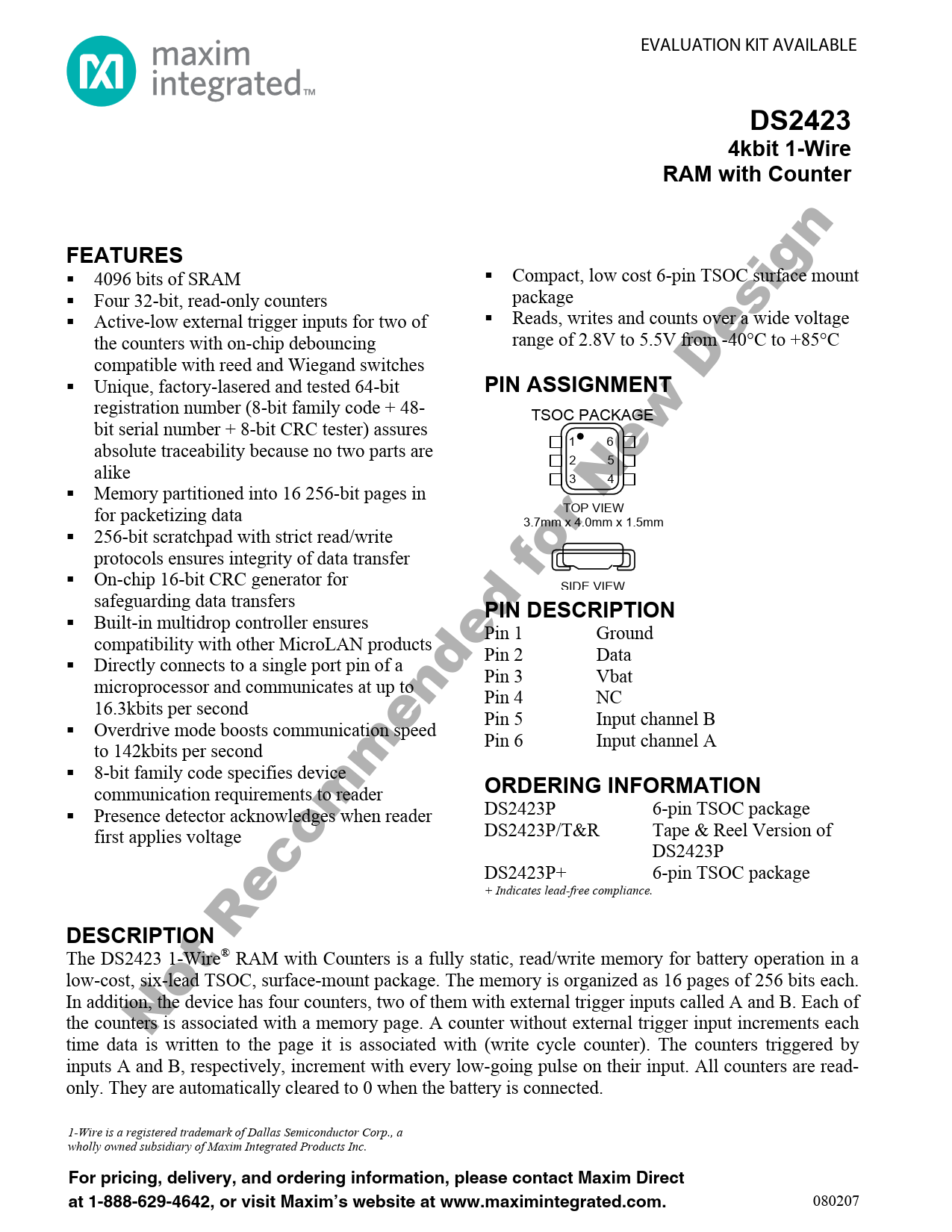 The DS2423 1-Wire® RAM with Counters is a fully static, read/write memory for battery operation in a low-cost, six-lead TSOC, surface-mount package. The memory is organized as 16 pages of 256 bits each. In addition, the device has four counters, two of them with external trigger inputs called A and B. Each of the counters is associated with a memory page. A counter without external trigger input increments each