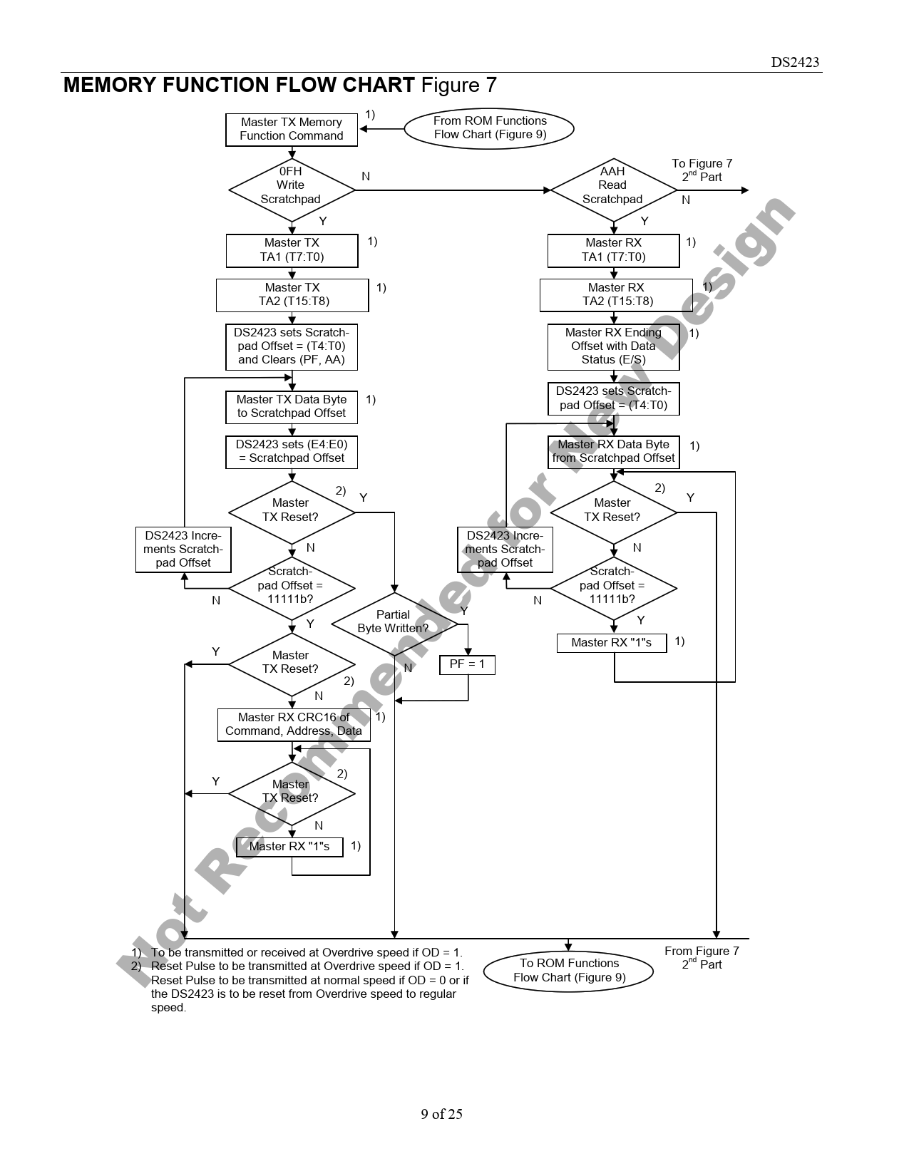 DS2423 MEMORY FUNCTION FLOW CHART Figure 7 Master TX Memory 1) From ROM Functions Function Command Flow Chart (Figure 9) To Figure 7 0FH AAH N 2nd Part Write Read Scratchpad Scratchpad N Y Y Master TX 1) Master RX 1) TA1 (T7:T0) TA1 (T7:T0) Master TX 1) Master RX 1) TA2 (T15:T8) TA2 (T15:T8) DS2423 sets Scratch- Master RX Ending 1) pad Offset = (T4:T0) Offset with Data and Clears (PF, AA) Status (E/S) DS2423 sets Scratch- Master TX Data Byte 1) pad Offset = (T4:T0) to Scratchpad Offset DS2423 sets (E4:E0) Master RX Data Byte 1) = Scratchpad Offset from Scratchpad Offset 2) 2) Master Y Master Y TX Reset? TX Reset? DS2423 Incre- DS2423 Incre- ments Scratch- N ments Scratch- N pad Offset pad Offset Scratch- Scratch- pad Offset = pad Offset = N 11111b? N 11111b? Partial Y Y Byte Written? Y Master RX "1"s 1) Y Master TX Reset? PF = 1 N 2) N Master RX CRC16 of 1) Command, Address, Data 2) Y Master TX Reset? N Master RX "1"s 1) 1) To be transmitted or received at Overdrive speed if OD = 1. From Figure 7 2) Reset Pulse to be transmitted at Overdrive speed if OD = 1. To ROM Functions 2nd Part Not Recommended for New Design Reset Pulse to be transmitted at normal speed if OD = 0 or if Flow Chart (Figure 9) the DS2423 is to be reset from Overdrive speed to regular speed. 9 of 25