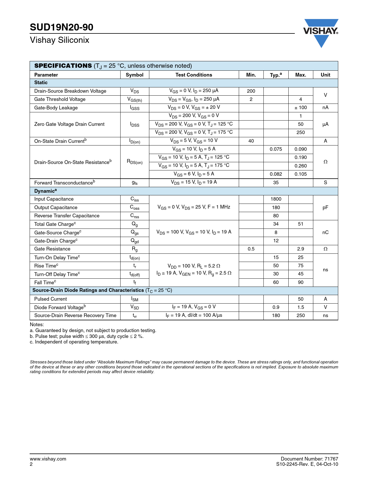 SUD19N20-90 SPECIFICATIONS Parameter Symbol Test Conditions Min Typ.a Max Unit Static Dynamica
