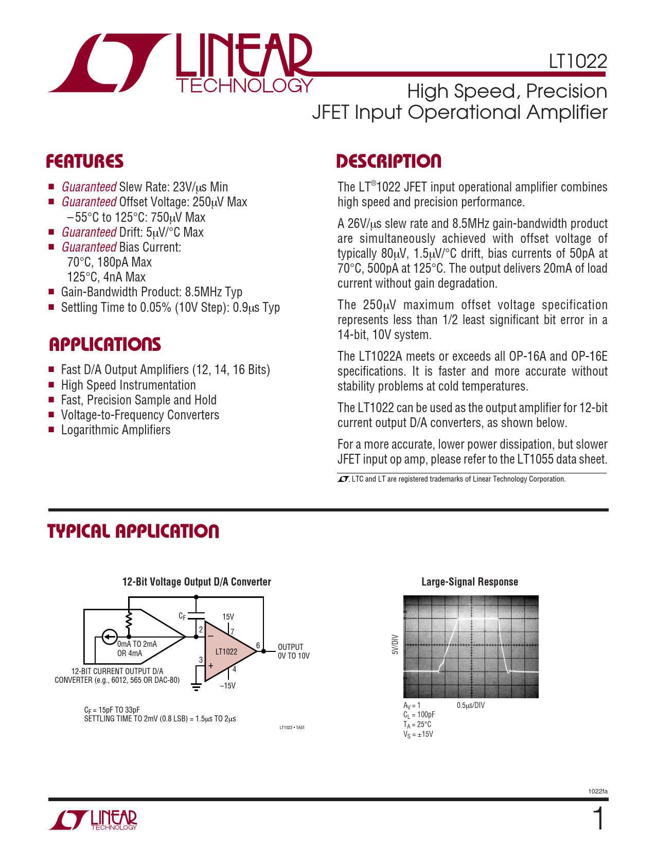 LT1022 High Speed, Precision JFET Input Operational Amplifier