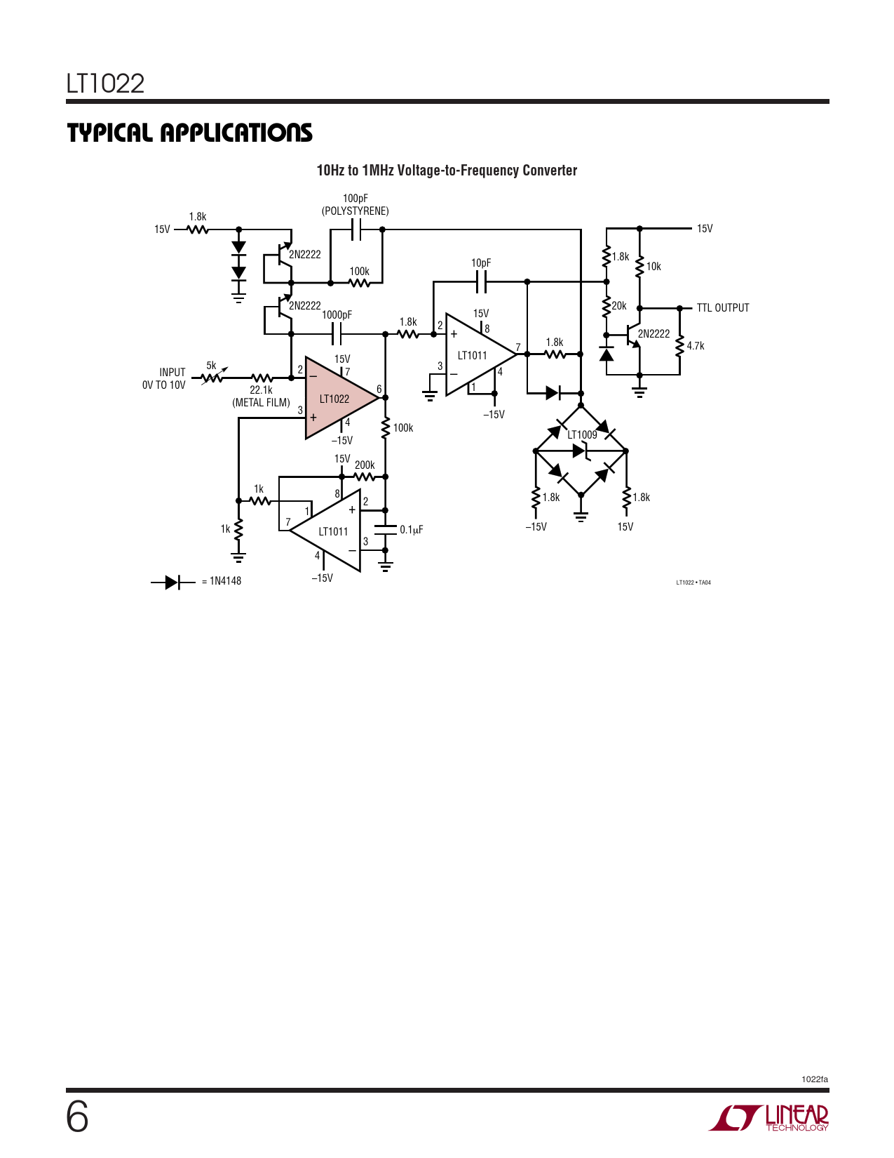 100pF (POLYSTYRENE) 1.8k 15V 15V 2N2222 1.8k 10pF 10k 100k 2N2222 20k TTL OUTPUT 1000pF 15V 1.8k 2 8 + 2N2222 7 1.8k 4.7k LT1011 15V 5k 3 INPUT 2 7 4 – – 0V TO 10V 1 22.1k 6 LT1022 (METAL FILM) 3 + –15V 4 100k LT1009 –15V 15V 200k 1k 8 1.8k 1.8k + 2 1 7 –15V 15V 1k LT1011 0.1µF – 3 4 –15V = 1N4148 LT1022 • TA04 1022fa 6