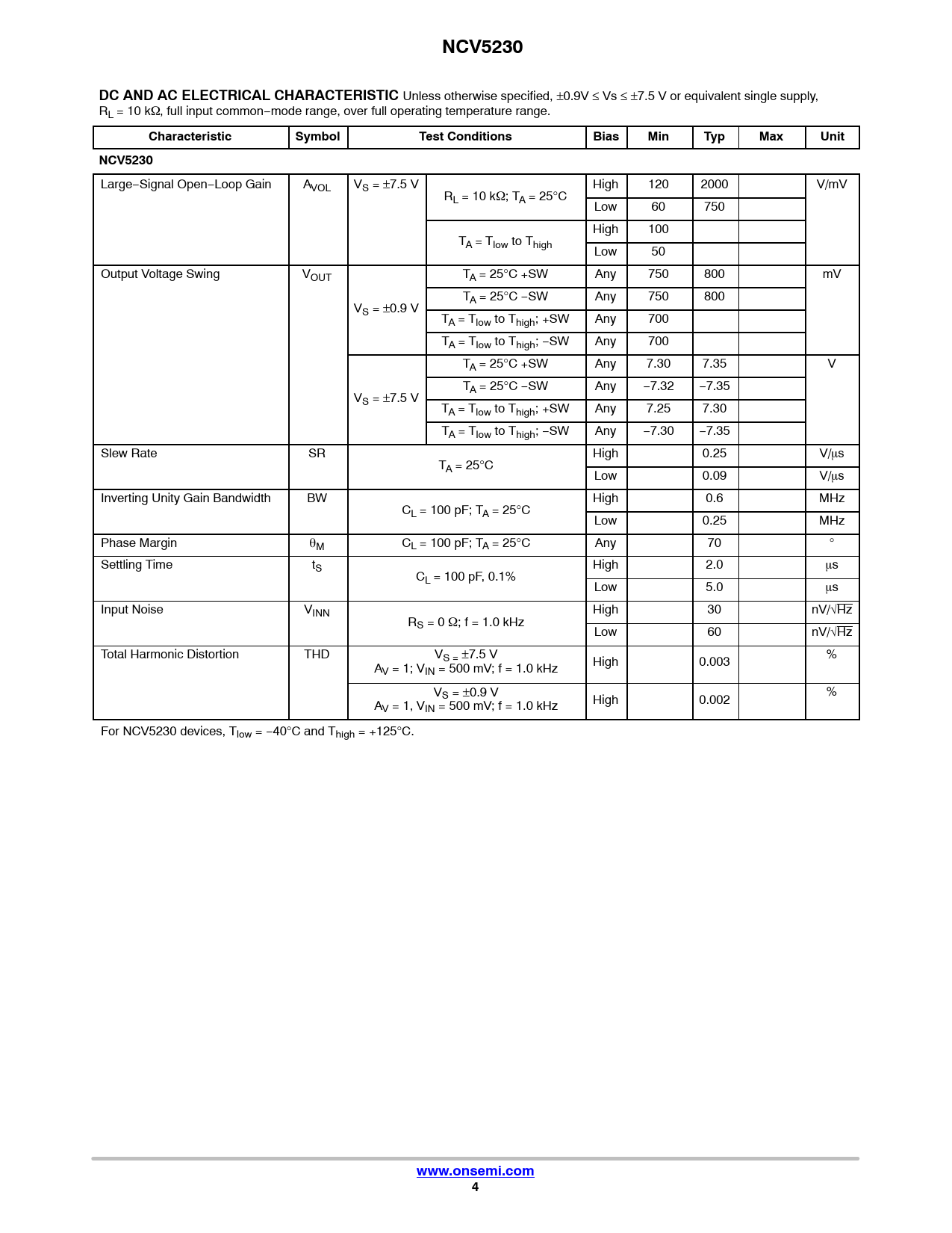 Large−Signal Open−Loop Gain AVOL VS = ±7.5 V High 120 2000 V/mV RL = 10 kW; TA = 25°C Low 60 750 High 100 TA = Tlow to Thigh Low 50 Output Voltage Swing VOUT TA = 25°C +SW Any 750 800 mV TA = 25°C −SW Any 750 800 VS = ±0.9 V TA = Tlow to Thigh; +SW Any 700 TA = Tlow to Thigh; −SW Any 700 TA = 25°C +SW Any 7.30 7.35 V TA = 25°C −SW Any −7.32 −7.35 VS = ±7.5 V TA = Tlow to Thigh; +SW Any 7.25 7.30 TA = Tlow to Thigh; −SW Any −7.30 −7.35 Slew Rate SR High 0.25 V/ms TA = 25°C Low 0.09 V/ms Inverting Unity Gain Bandwidth BW High 0.6 MHz CL = 100 pF; TA = 25°C Low 0.25 MHz Phase Margin qM CL = 100 pF; TA = 25°C Any 70 ° Settling Time tS High 2.0 ms CL = 100 pF, 0.1% Low 5.0 ms Input Noise VINN High 30 nV/√Hz RS = 0 W; f = 1.0 kHz Low 60 nV/√Hz Total Harmonic Distortion THD VS = ±7.5 V % AV = 1; VIN = 500 mV; f = 1.0 kHz High 0.003 VS = ±0.9 V % AV = 1, VIN = 500 mV; f = 1.0 kHz High 0.002 For NCV5230 devices, Tlow = −40°C and Thigh = +125°C.