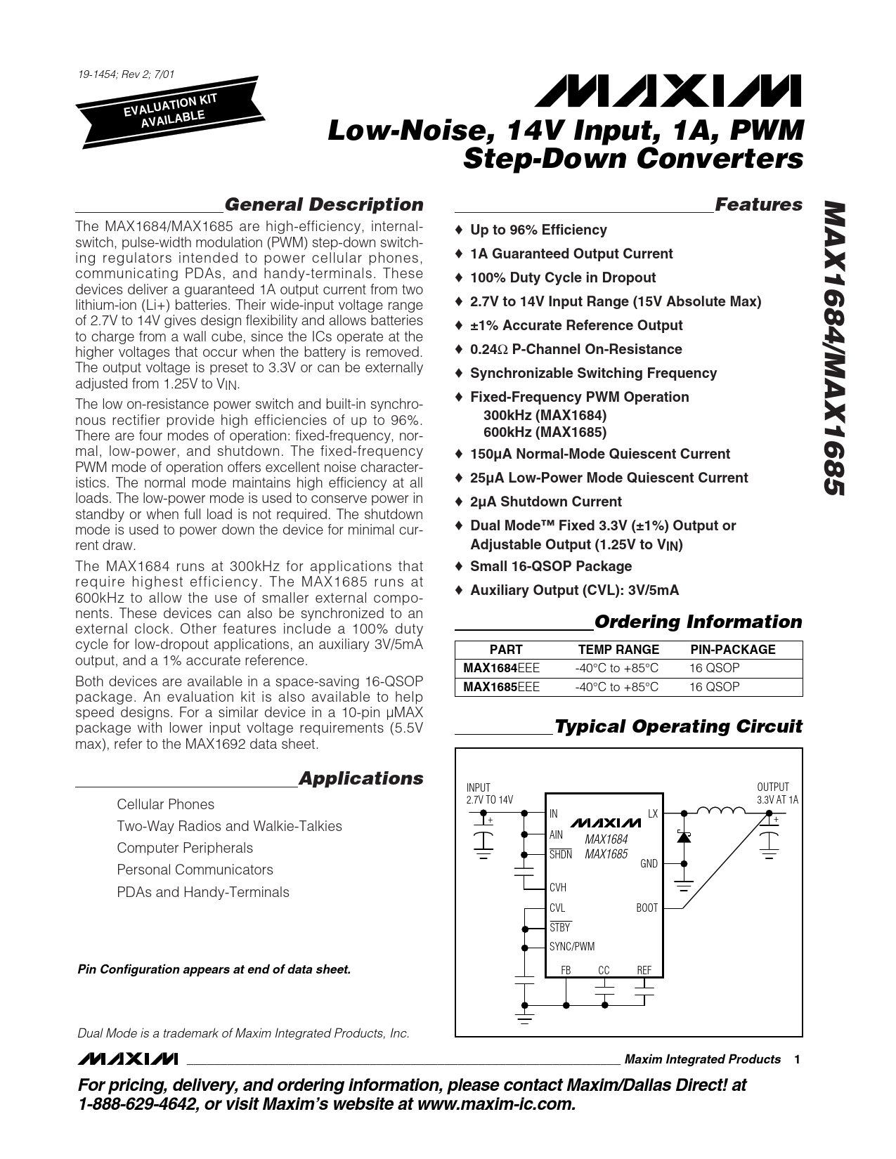 EVALUATION KIT. AVAILABLE. Low-Noise, 14V Input, 1A, PWM. Step-Down Converters. MAX1684/MAX1685. General Description. Features