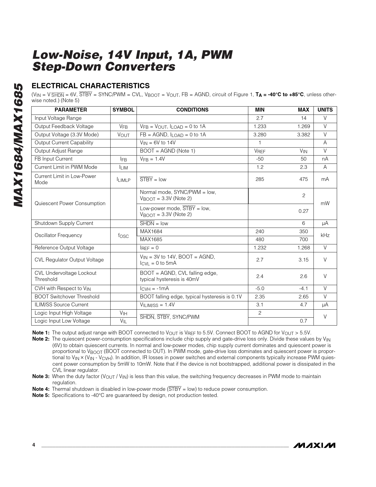 Low-Noise, 14V Input, 1A, PWM Step-Down Converters. ELECTRICAL CHARACTERISTICS. TA = -40°C to +85°C. PARAMETER. SYMBOL