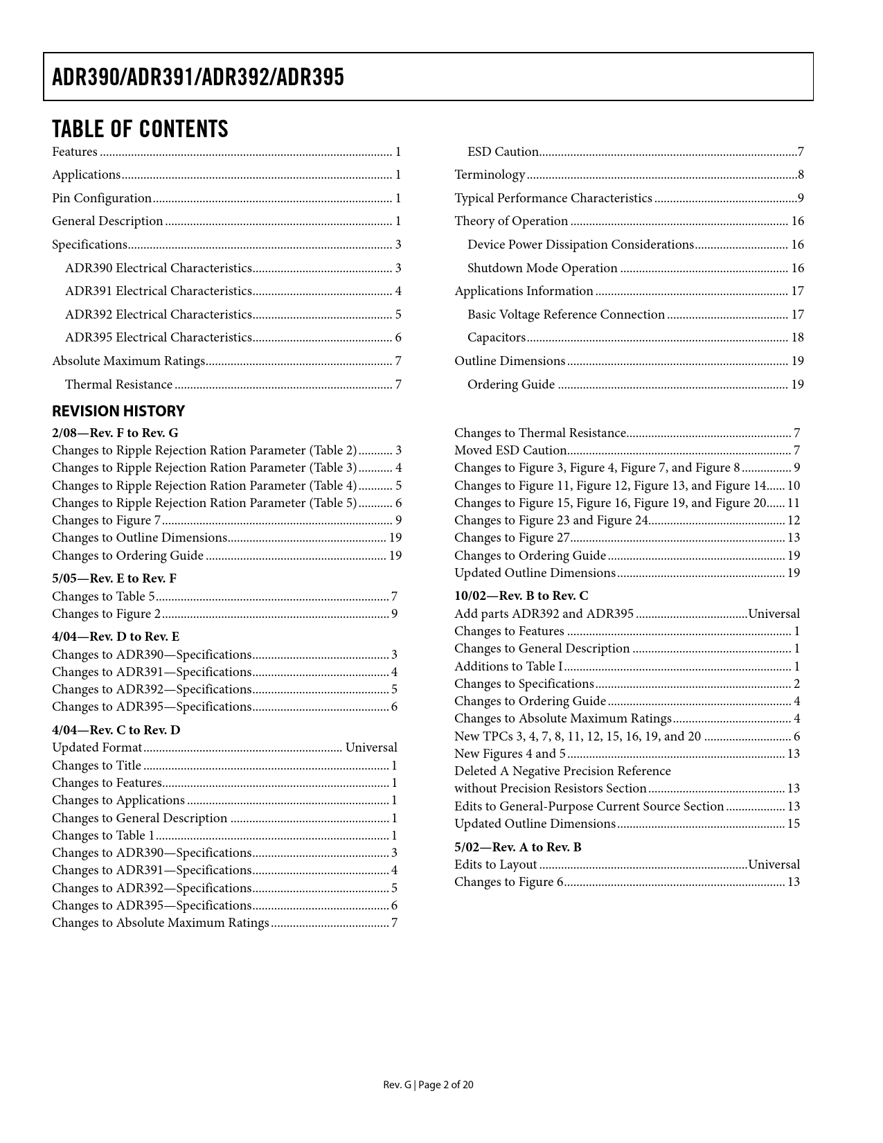 link to page 3 link to page 4 link to page 5 link to page 6 link to page 7 link to page 8 link to page 9 link to page 16 link to page 17 link to page 19 link to page 19 link to page 1 link to page 1 link to page 1 link to page 1 link to page 3 link to page 7 link to page 7 link to page 16 link to page 16 link to page 17 link to page 18 ADR390/ADR391/ADR392/ADR395TABLE OF CONTENTS Features .. 1 ESD Caution...7 Applications ... 1 Terminology ...8 Pin Configuration ... 1 Typical Performance Characteristics ..9 General Description ... 1 Theory of Operation .. 16 Specifications ... 3 Device Power Dissipation Considerations .. 16 ADR390 Electrical Characteristics ... 3 Shutdown Mode Operation .. 16 ADR391 Electrical Characteristics ... 4 Applications Information .. 17 ADR392 Electrical Characteristics ... 5 Basic Voltage Reference Connection ... 17 ADR395 Electrical Characteristics ... 6 Capacitors .. 18 Absolute Maximum Ratings .. 7 Outline Dimensions ... 19 Thermal Resistance .. 7 Ordering Guide .. 19 REVISION HISTORY2/08—Rev. F to Rev. G Changes to Thermal Resistance... 7 Changes to Ripple Rejection Ration Parameter (Table 2) ... 3 Moved ESD Caution.. 7 Changes to Ripple Rejection Ration Parameter (Table 3) ... 4 Changes to Figure 3, Figure 4, Figure 7, and Figure 8 .. 9 Changes to Ripple Rejection Ration Parameter (Table 4) ... 5 Changes to Figure 11, Figure 12, Figure 13, and Figure 14.. 10 Changes to Ripple Rejection Ration Parameter (Table 5) ... 6 Changes to Figure 15, Figure 16, Figure 19, and Figure 20.. 11 Changes to Figure 7 .. 9 Changes to Figure 23 and Figure 24.. 12 Changes to Outline Dimensions ... 19 Changes to Figure 27 ... 13 Changes to Ordering Guide .. 19 Changes to Ordering Guide ... 19 5/05—Rev. E to Rev. F Updated Outline Dimensions .. 19 Changes to Table 5 ... 7 10/02—Rev. B to Rev. C Changes to Figure 2 ... 9 Add parts ADR392 and ADR395 .. Universal 4/04—Rev. D to Rev. E Changes to Features .. 1 Changes to ADR390—Specifications .. 3 Changes to General Description ... 1 Changes to ADR391—Specifications .. 4 Additions to Table I ... 1 Changes to ADR392—Specifications .. 5 Changes to Specifications ... 2 Changes to ADR395—Specifications .. 6 Changes to Ordering Guide ... 4 Changes to Absolute Maximum Ratings .. 4 4/04—Rev. C to Rev. D New TPCs 3, 4, 7, 8, 11, 12, 15, 16, 19, and 20 .. 6 Updated Format .. Universal New Figures 4 and 5 .. 13 Changes to Title ... 1 Deleted A Negative Precision Reference Changes to Features ... 1 without Precision Resistors Section .. 13 Changes to Applications ... 1 Edits to General-Purpose Current Source Section ... 13 Changes to General Description ... 1 Updated Outline Dimensions .. 15 Changes to Table 1 ... 1 Changes to ADR390—Specifications .. 3 5/02—Rev. A to Rev. B Changes to ADR391—Specifications .. 4 Edits to Layout ... Universal Changes to ADR392—Specifications .. 5 Changes to Figure 6 ... 13 Changes to ADR395—Specifications .. 6 Changes to Absolute Maximum Ratings .. 7 Rev. G | Page 2 of 20 Document Outline FEATURES APPLICATIONS PIN CONFIGURATION GENERAL DESCRIPTION TABLE OF CONTENTS REVISION HISTORY SPECIFICATIONS ADR390 ELECTRICAL CHARACTERISTICS ADR391 ELECTRICAL CHARACTERISTICS ADR392 ELECTRICAL CHARACTERISTICS ADR395 ELECTRICAL CHARACTERISTICS ABSOLUTE MAXIMUM RATINGS THERMAL RESISTANCE ESD CAUTION TERMINOLOGY TYPICAL PERFORMANCE CHARACTERISTICS THEORY OF OPERATION DEVICE POWER DISSIPATION CONSIDERATIONS SHUTDOWN MODE OPERATION APPLICATIONS INFORMATION BASIC VOLTAGE REFERENCE CONNECTION Stacking Reference ICs for Arbitrary Outputs A Negative Precision Reference without Precision Resistors General-Purpose Current Source High Power Performance with Current Limit CAPACITORS Input Capacitor Output Capacitor OUTLINE DIMENSIONS ORDERING GUIDE
