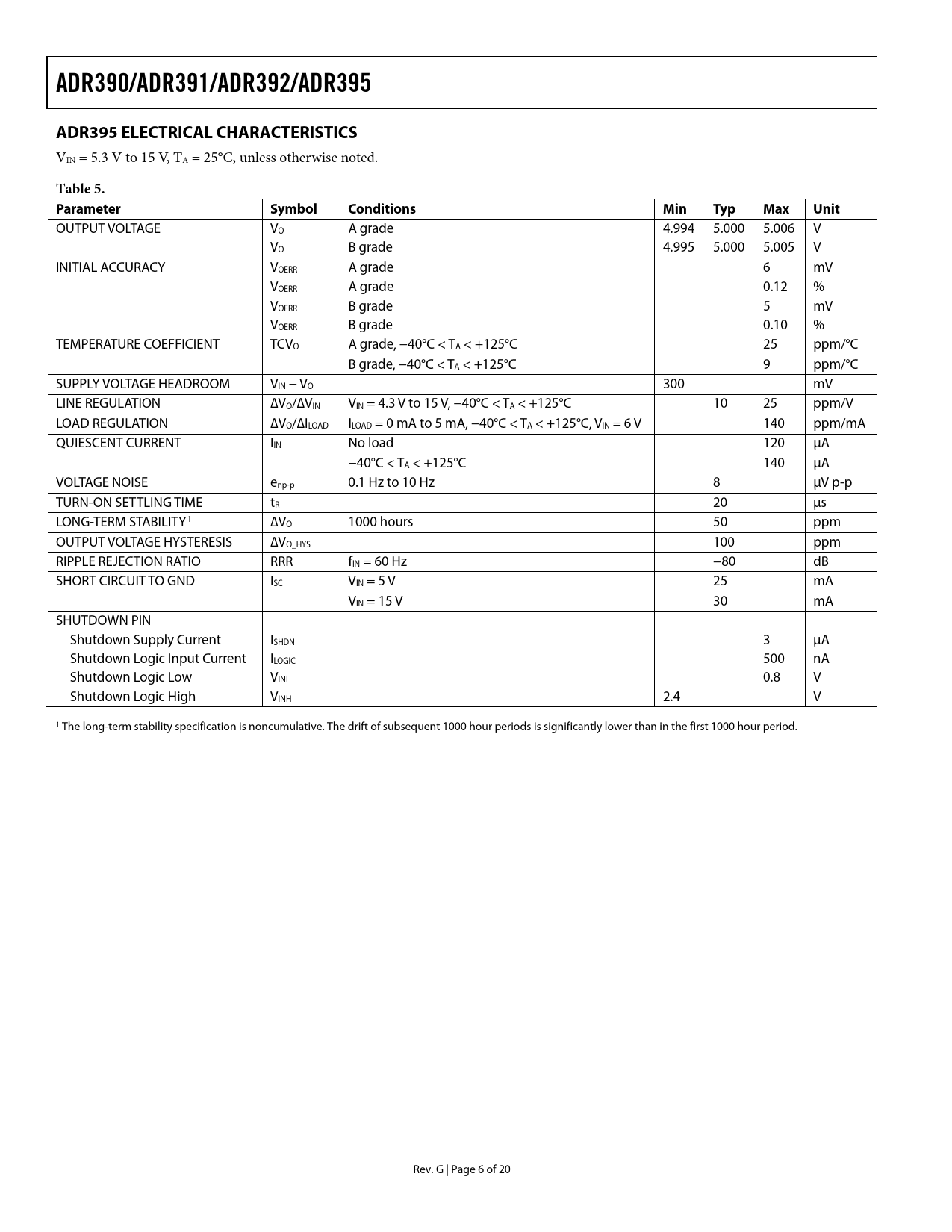Páginas / Página20 / 6 — ADR390/ADR391/ADR392/ADR395. ADR395 ELECTRICAL CHARACTERISTICS. Table 5. …