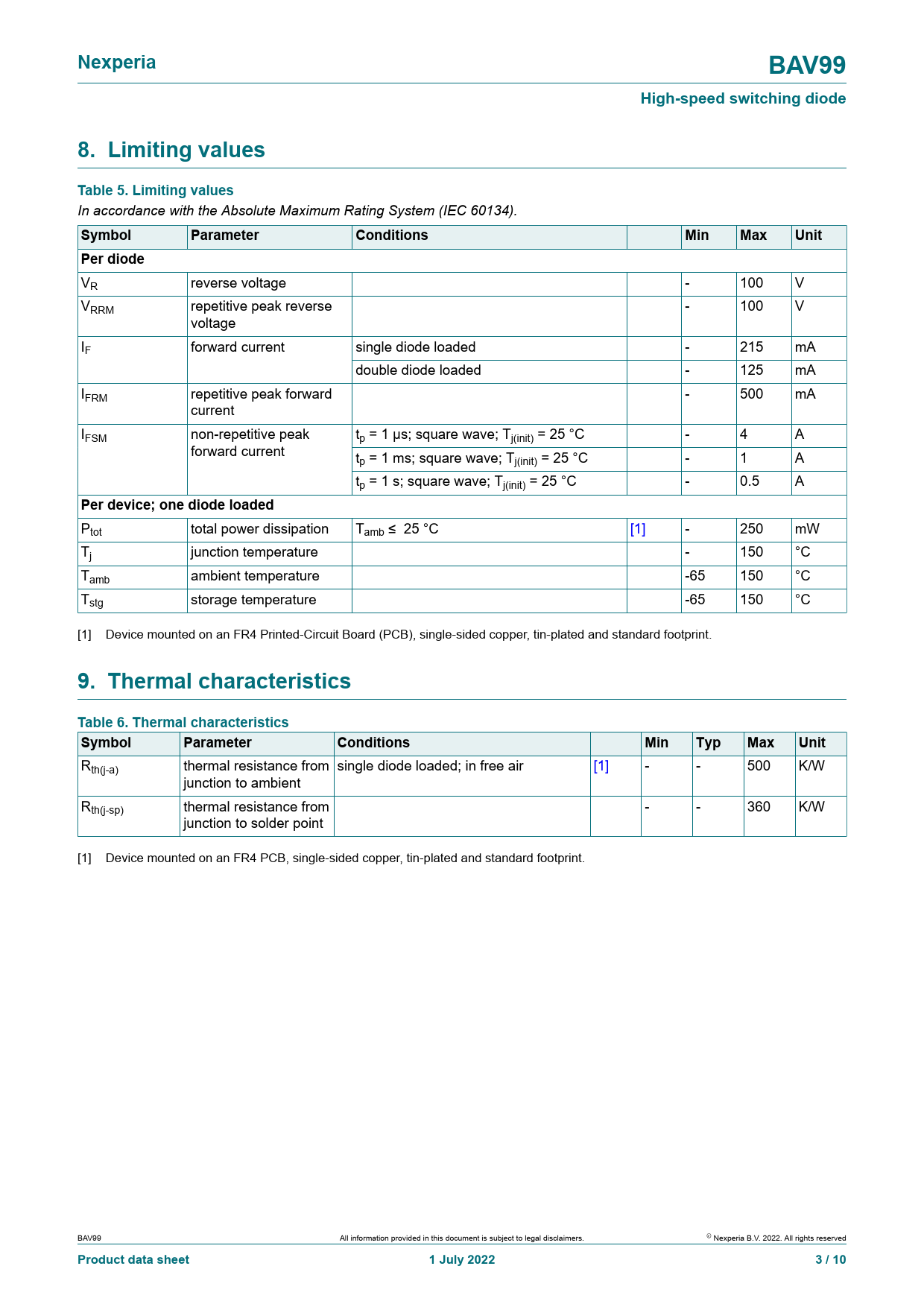 | Páginas / Página | 10 / 3 — Nexperia. BAV99. High-speed switching diode. 8. Limiting values Table 5. … |