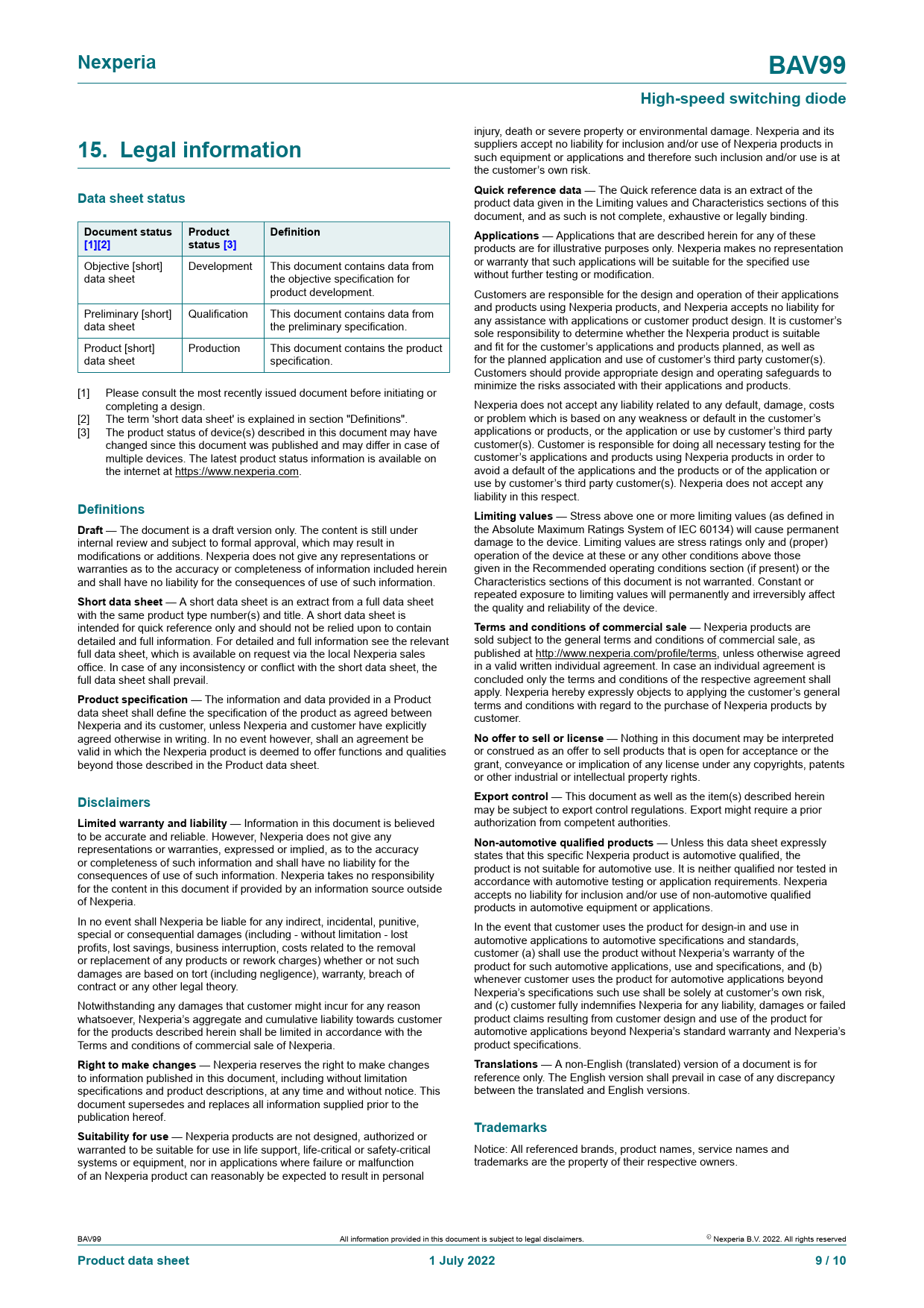 | Páginas / Página | 10 / 9 — Nexperia. BAV99. High-speed switching diode. 15. Legal information. Data … |