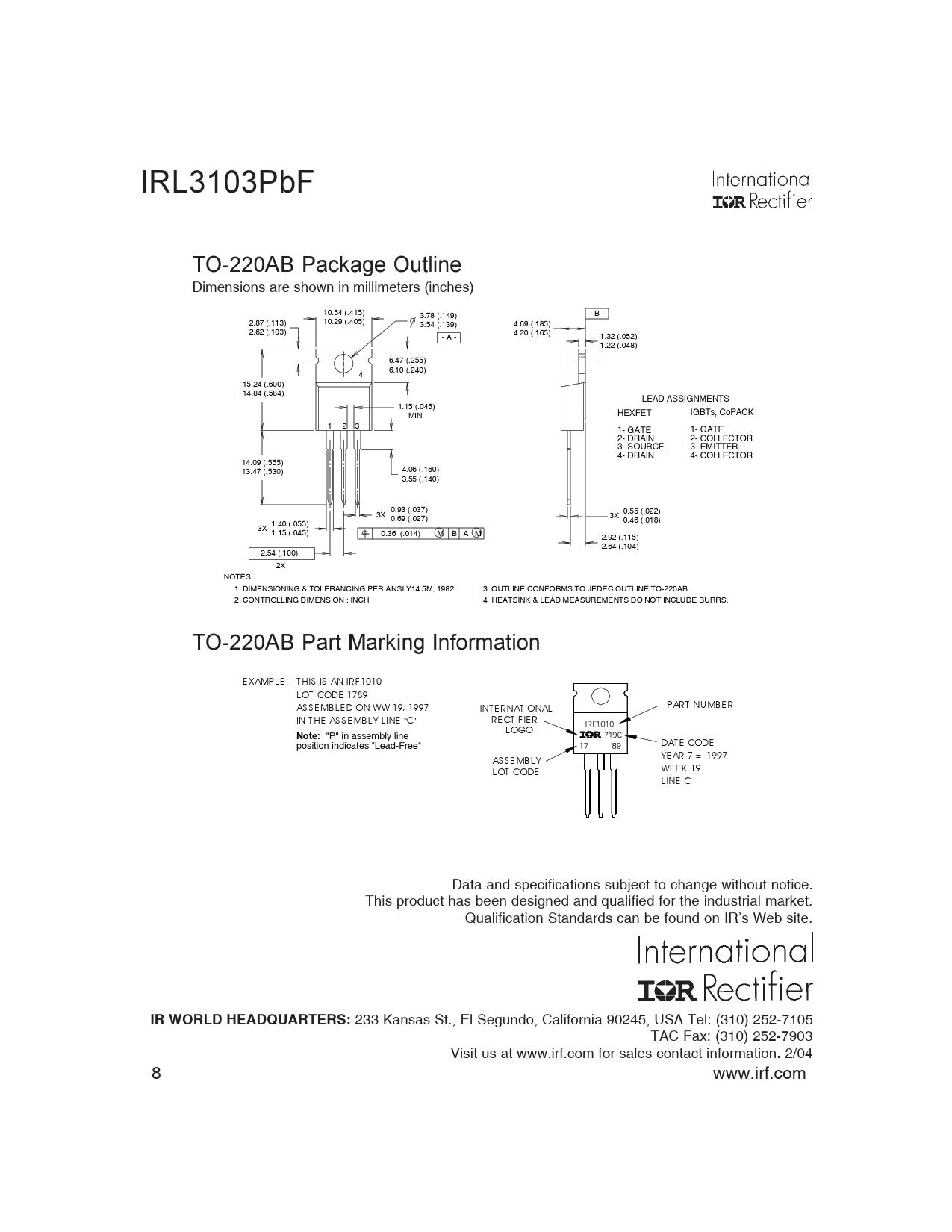 "P" in assembly line DAT E CODE position indicates "Lead-Free" AS S E MB L Y YE AR 7 = 1997 L OT CODE WE E K 19 L INE C Data and specifications subject to change without notice. This product has been designed and qualified for the industrial market. Qualification Standards can be found on IR’s Web site.