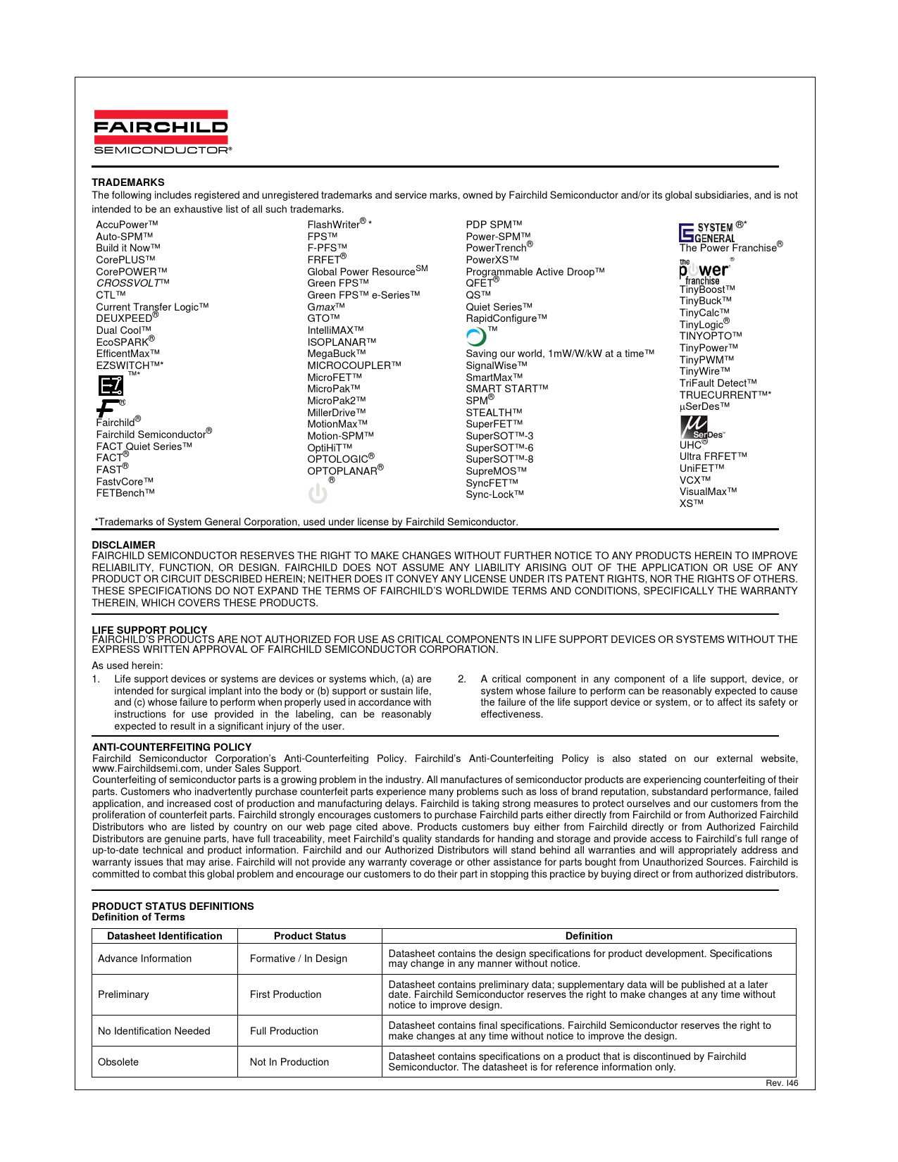 TRADEMARKS. DISCLAIMER. LIFE SUPPORT POLICY. ANTI-COUNTERFEITING POLICY. PRODUCT STATUS DEFINITIONS Definition of Terms